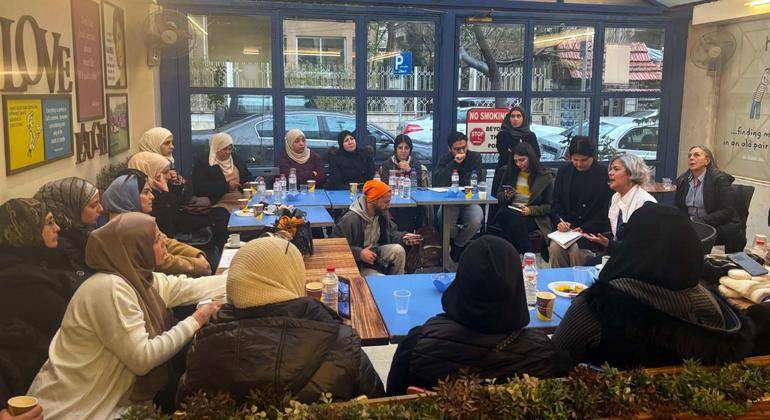رئيسة المؤسسة المستقلة المعنية بالمفقودين في سوريا كارلا كينتانا (يمين ترتدي معطفاً أبيض) أثناء لقائها سيدات سوريات ما زلن يبحثن عن أفراد عائلاتهن المفقودين (الأمم المتحدة)