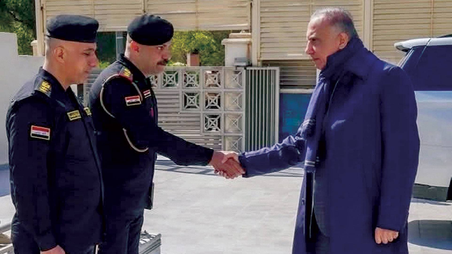 الكاظمي مصافحاً ضابط شرطة قرب منزله في «المنطقة الخضراء»... (إكس)