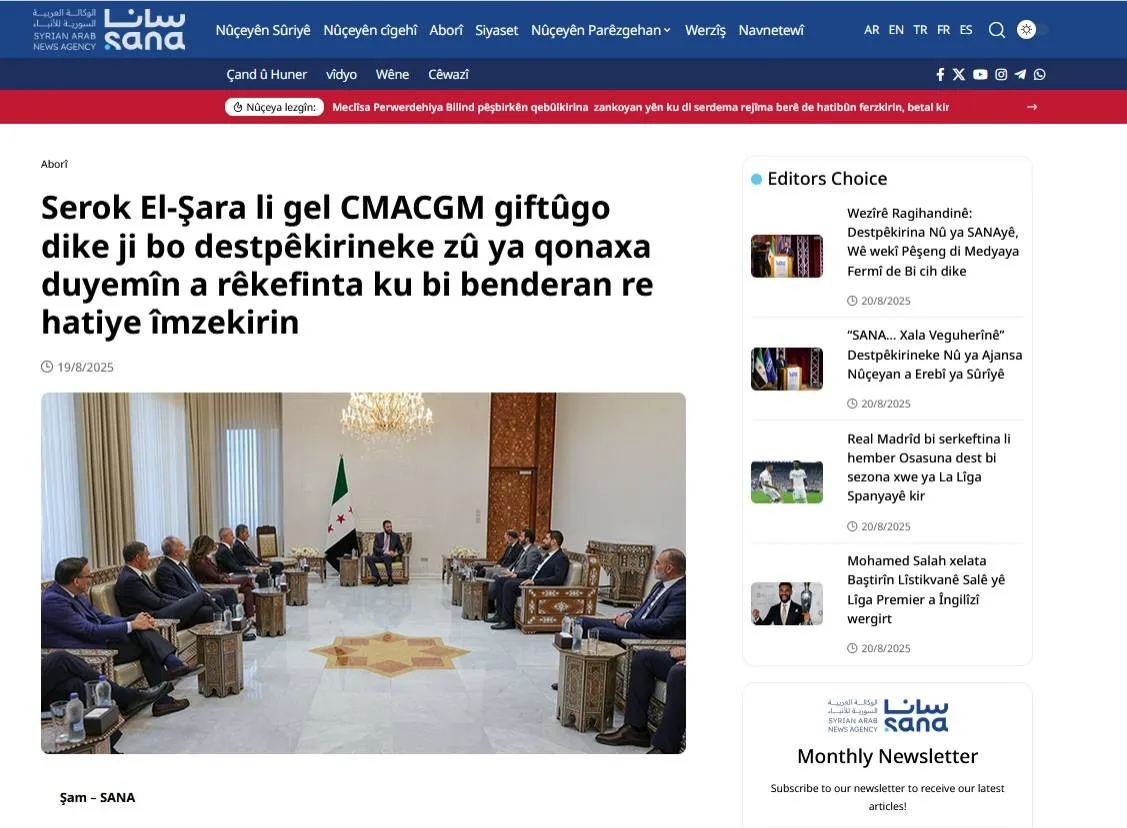 أطلقت الوكالة العربية السورية للأنباء (سانا) نسختها باللغة الكردية ضمن انطلاقتها بهوية جديدة، لتقطع مع تاريخها الذي ارتبط بحقبة نظام البعث منذ تأسيسها عام 1965. وفي سابقة بتاريخ الإعلام الرسمي السوري، أضافت «سانا» اللغة الكردية إلى جانب اللغات الرئيسية التي تعتمدها، بعد عقود طويلة من حظر استخدام اللغات السورية غير العربية في الإعلام.
