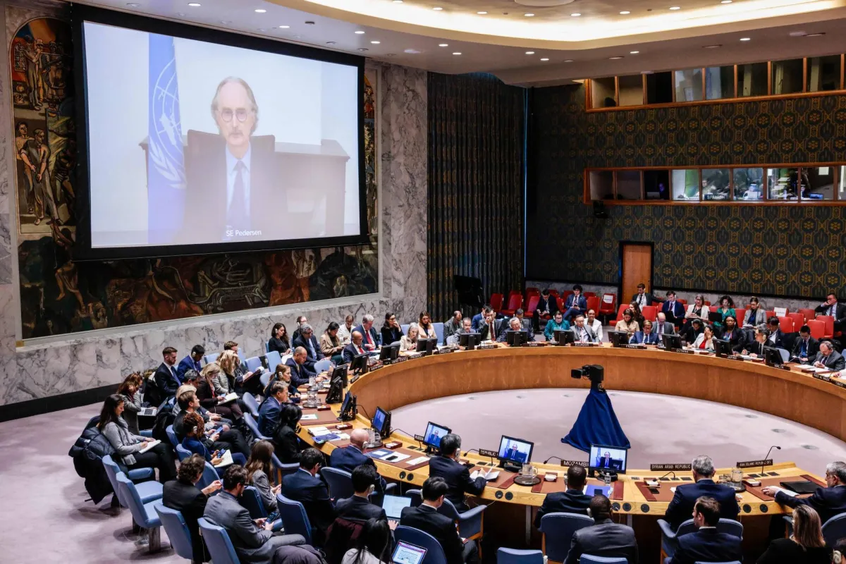 غير بيدرسن المبعوث الأممي الخاص إلى سوريا يتحدث إلى مجلس الأمن عبر تقنية الفيديو خلال جلسة طارئة بشأن سوريا ديسمبر 2024 (أ.ف.ب)