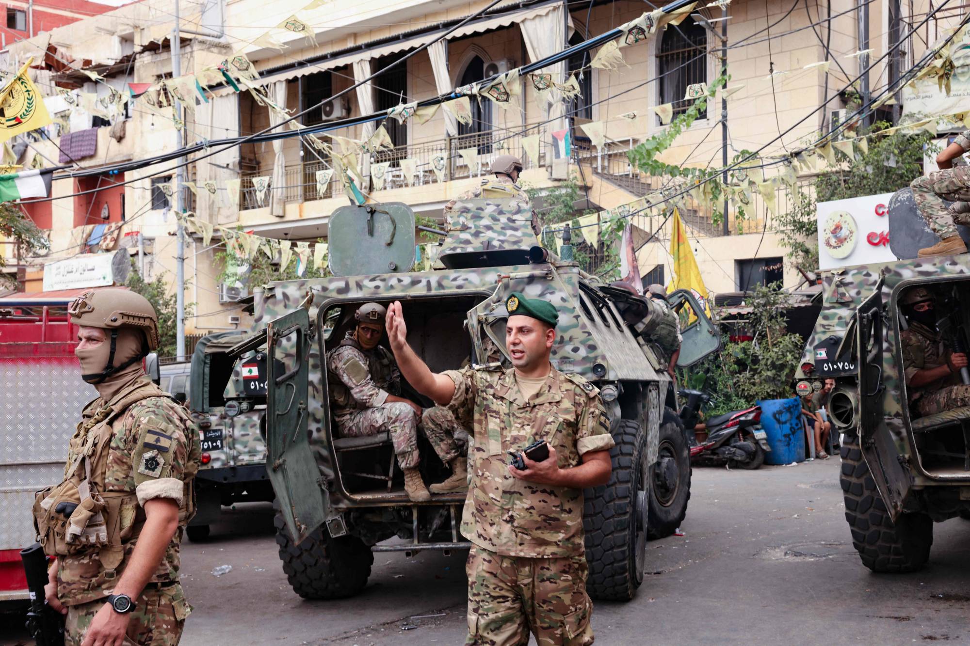 جنود من الجيش اللبناني متمركزون في مخيم برج البراجنة للاجئين الفلسطينيين في الضاحية الجنوبية لبيروت في 29 أغسطس 2025 في حين تواصل الجماعات الفلسطينية المسلحة في المخيمات تسليم أسلحتها للسلطات اللبنانية (أ.ف.ب)