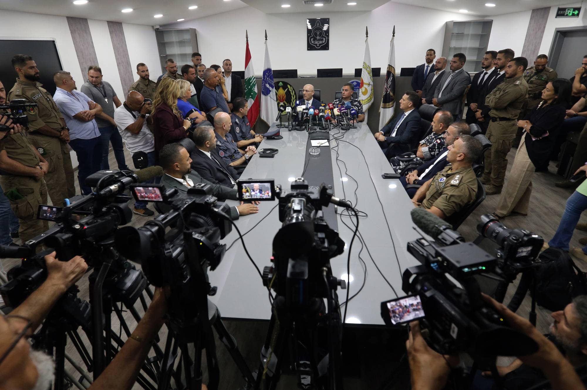 وزير الداخلية أحمد الحجار في مؤتمر صحافي في بيروت الاثنين معلناً عن تفكيك الشبكة وإحباط عملية التهريب (إ.ب.أ)
