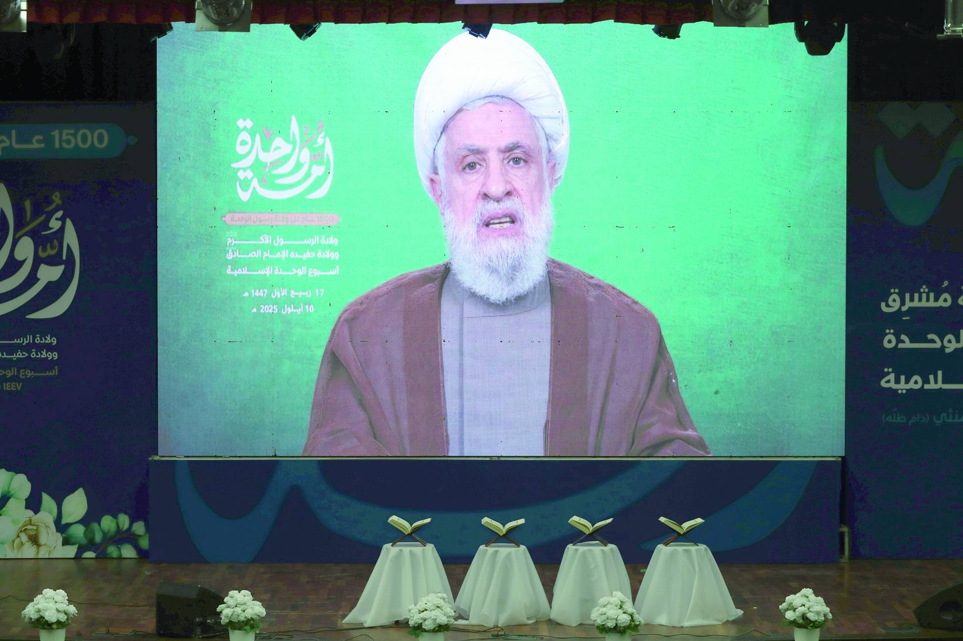 الأمين العام لـ«حزب الله» نعيم قاسم يتحدث عبر شاشة يوم الأربعاء الماضي (إ.ب.أ)