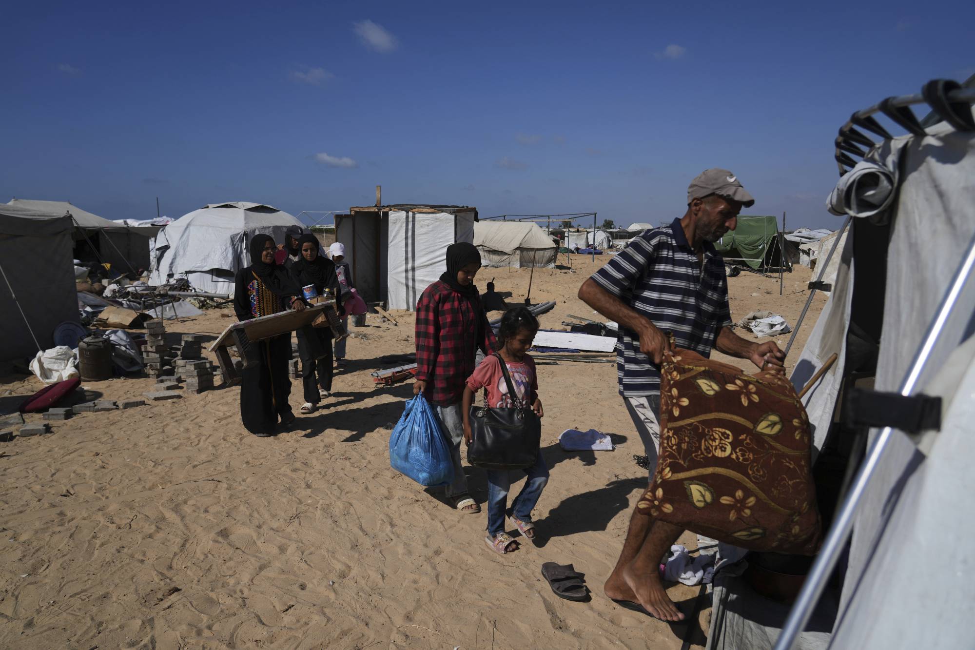 عائلة فلسطينية تدخل خيمتها الجديدة في خان يونس 11 سبتمبر 2025 (أ.ب)