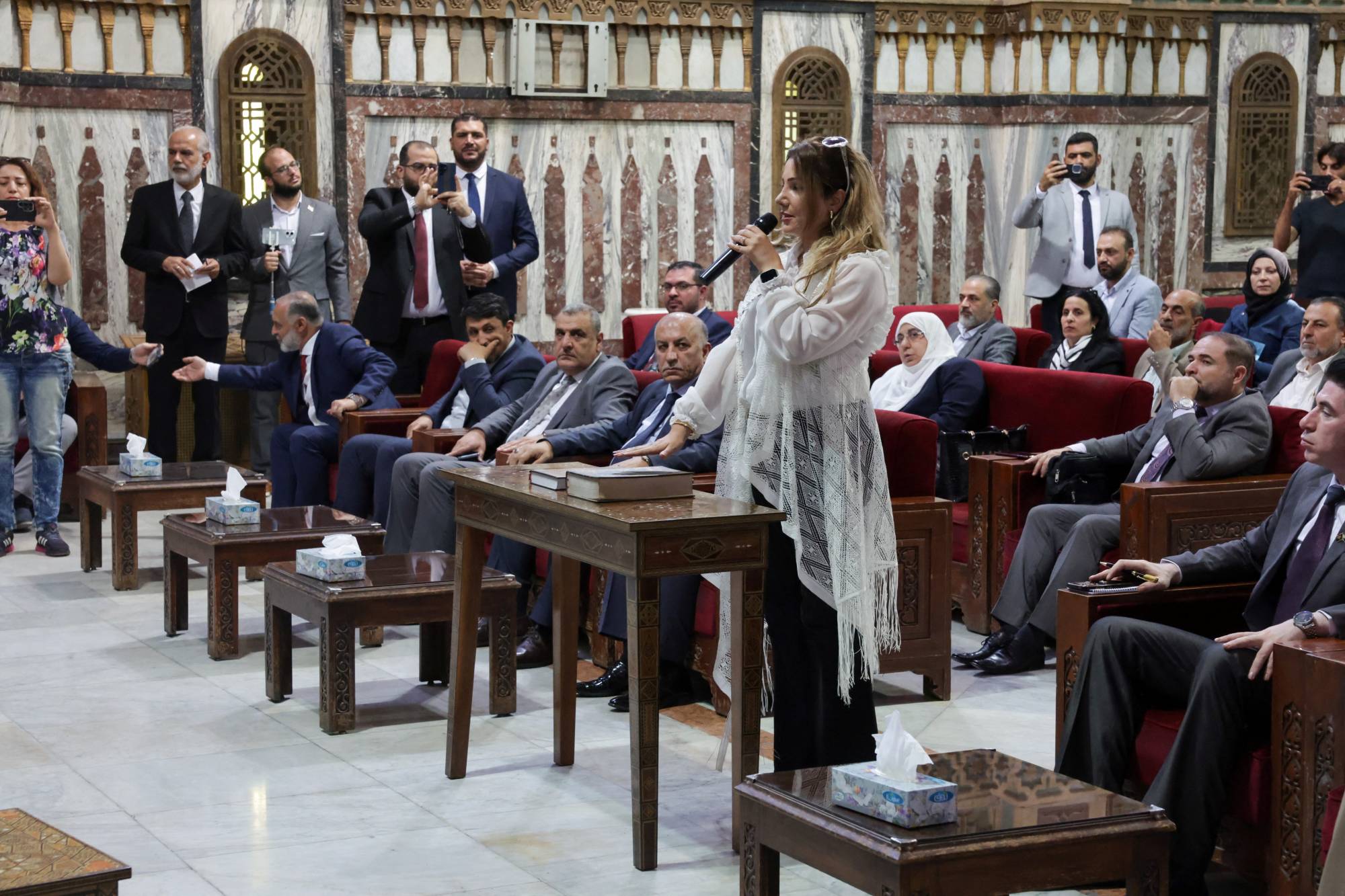 امرأة تحلف في أثناء اختيار أعضاء اللجنة الفرعية المشرفة على انتخابات البرلمان السوري - دمشق 3 سبتمبر 2025 (رويترز)