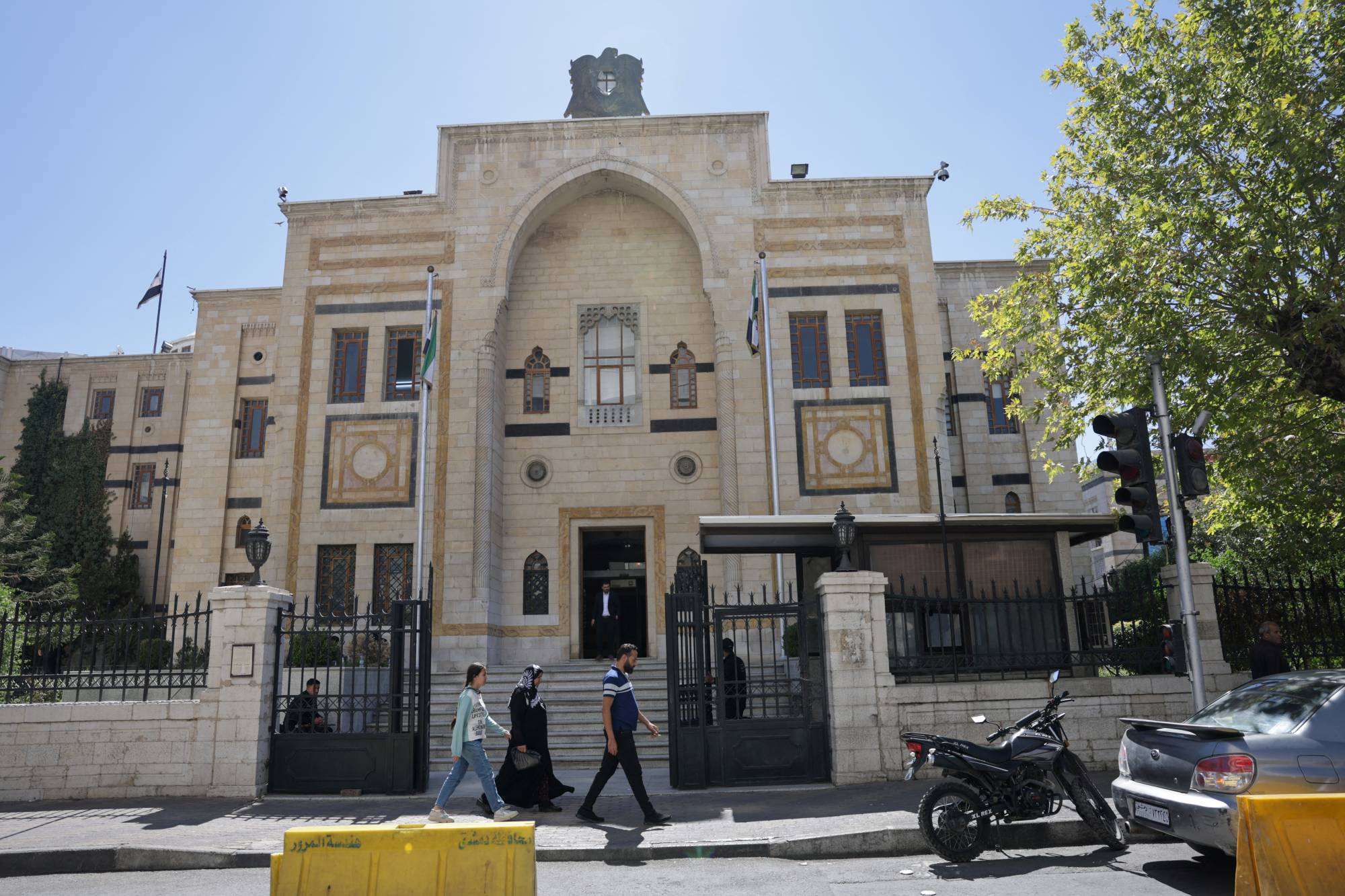 مجموعة من المدنيين يمرون أمام البوابة الرئيسية لمبنى البرلمان السوري في دمشق - 3 سبتمبر 2025 (رويترز)