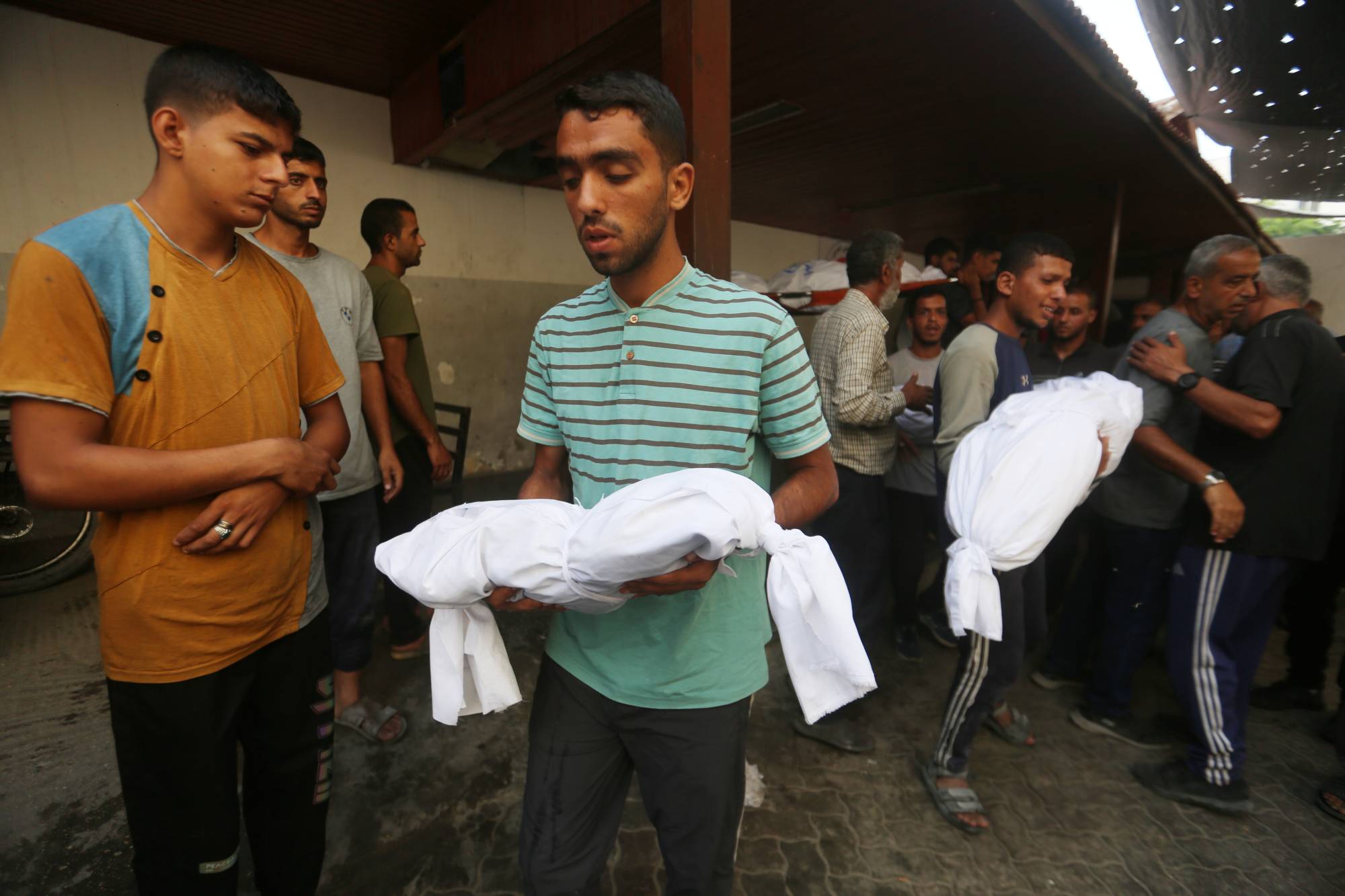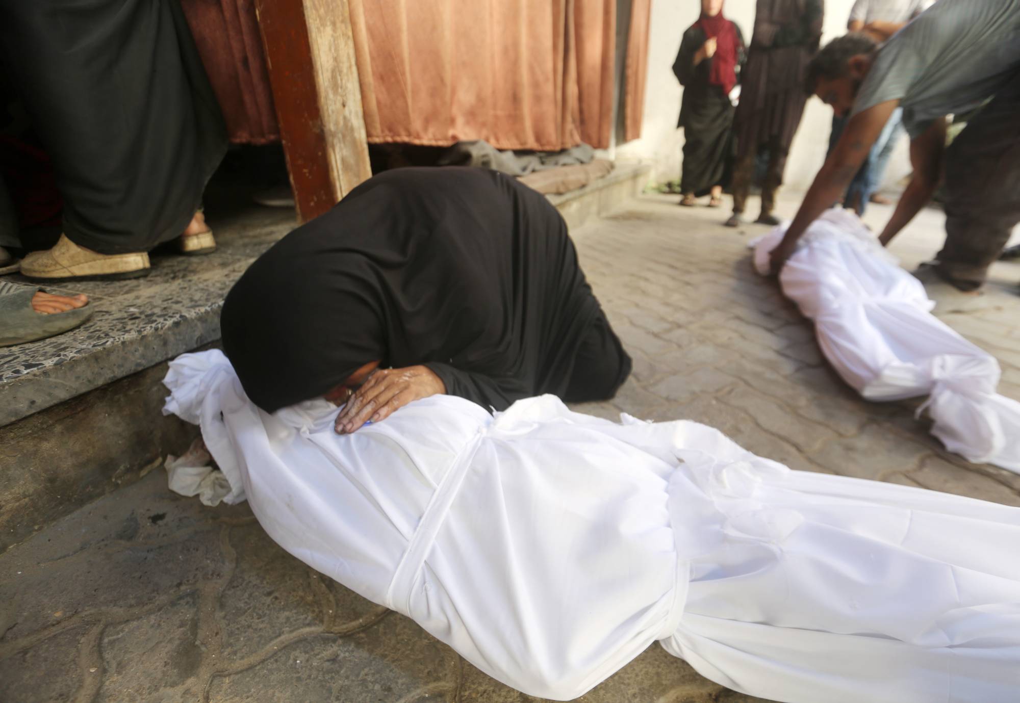 جثت نساء باكيات على ركبهنّ، لتوديع أحبائهن للمرة الأخيرة، محتضنات الجثامين المكفنة. وقد وُضعت على الأقل ست جثامين على الأرض، من بينها كفنان يبدوان بحجم طفلين.