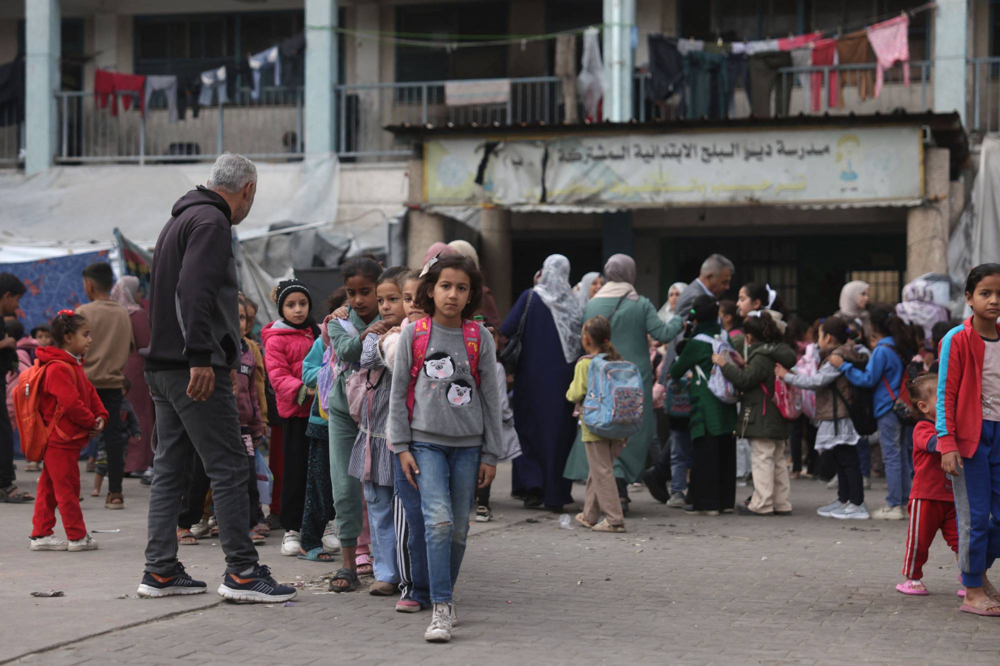 أطفال يستعدون للدخول إلى صفوفهم في مدرسة للأونروا تعيش فيها عائلات نازحة تضطر يومياً لإخراج أمتعتها لمتابعة يوم دراسي جديد في دير البلح وسط قطاع غزة السبت (أ.ف.ب)