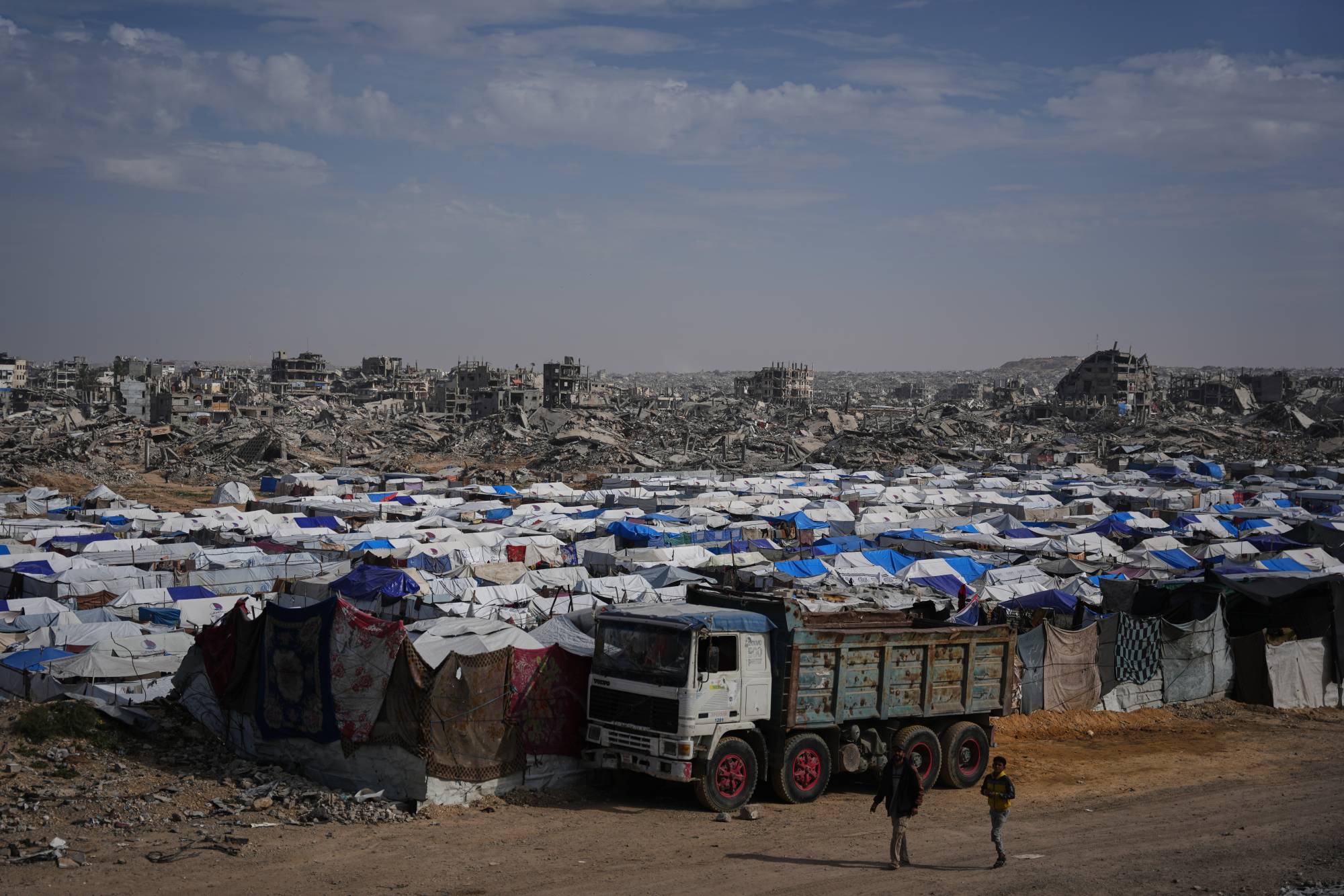 خيم النازحين وسط الدمار الذي أحدثه القصف الإسرائيلي جواً وبراً في مدينة غزة الجمعة (أ.ب)