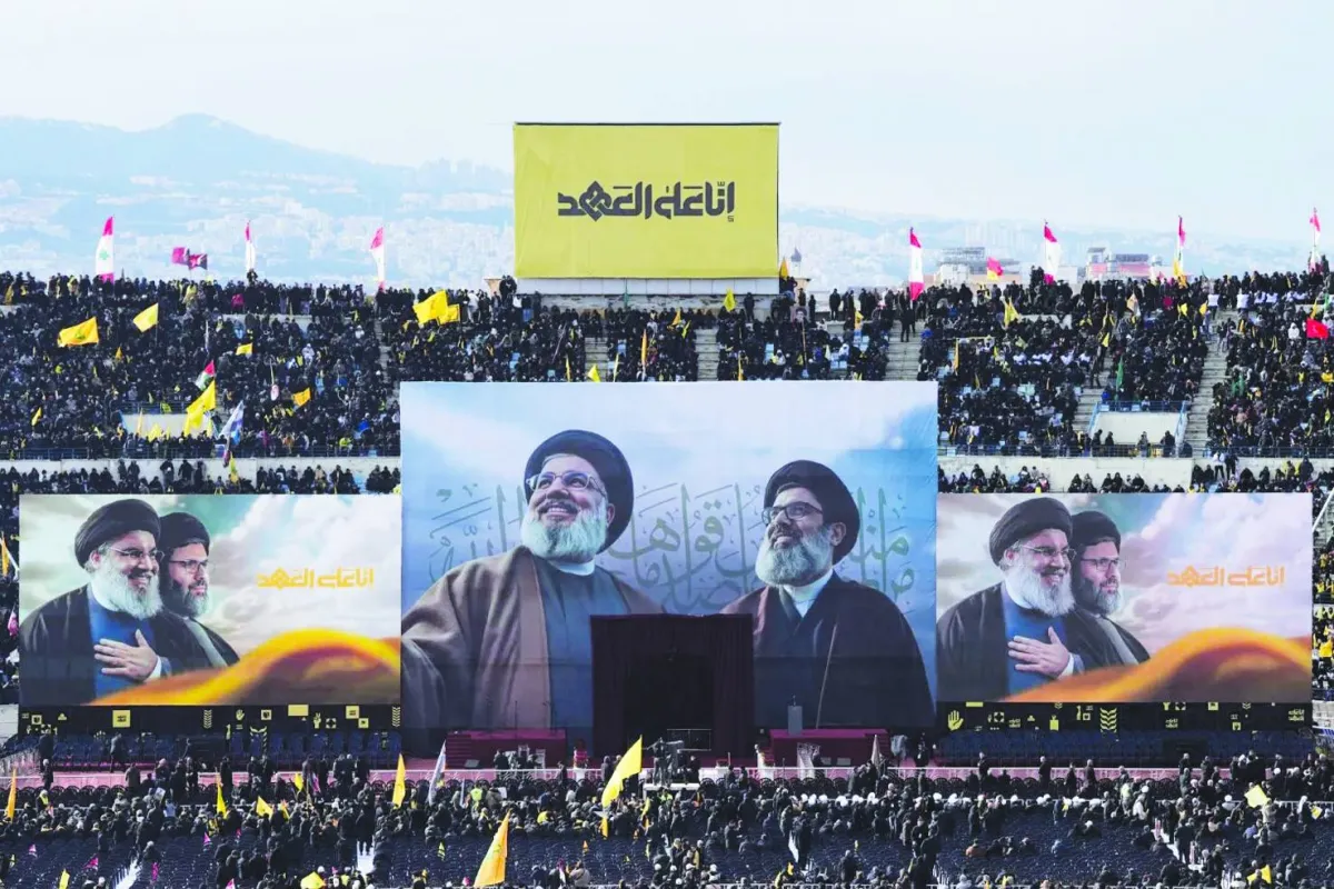 صورة تجمع نصر الله وصفي الدين في المدينة الرياضية ببيروت خلال تشييعهما في شهر فبراير الماضي (رويترز)