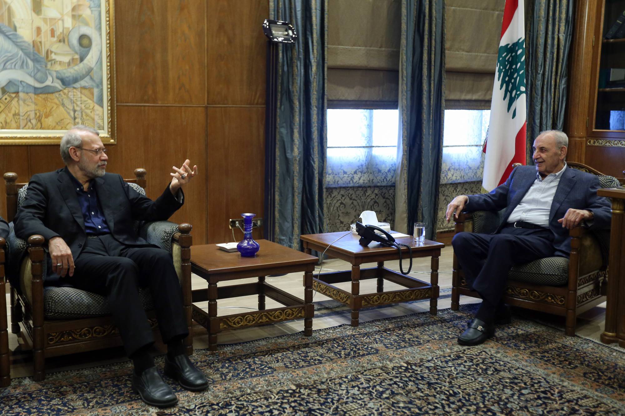 الأمين العام للمجلس الأعلى للأمن القومي الإيراني علي لاريجاني يلتقي رئيس مجلس النواب اللبناني نبيه بري في بيروت (إ.ب.أ)