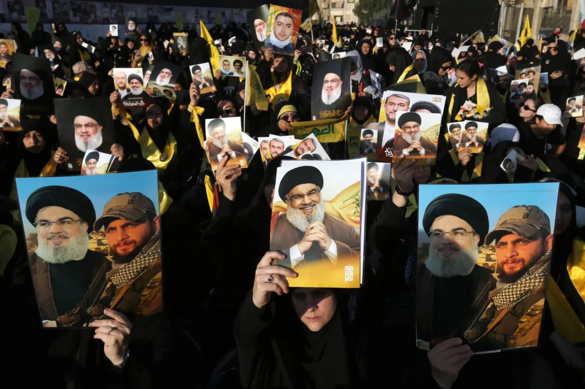 مناصرون لـ«حزب الله» يرفعون صور أمينه العام السابق في الذكرى السنوية الأولى لاغتياله بجنوب بيروت (إ.ب.أ)
