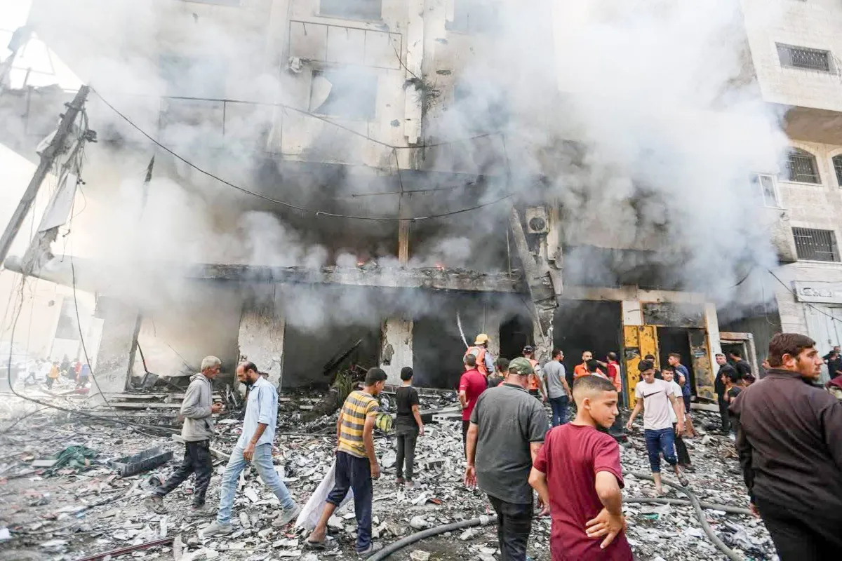 فلسطينيون خارج مبنى تضرر بغارة جوية إسرائيلية يوم الأحد (د.ب.أ)