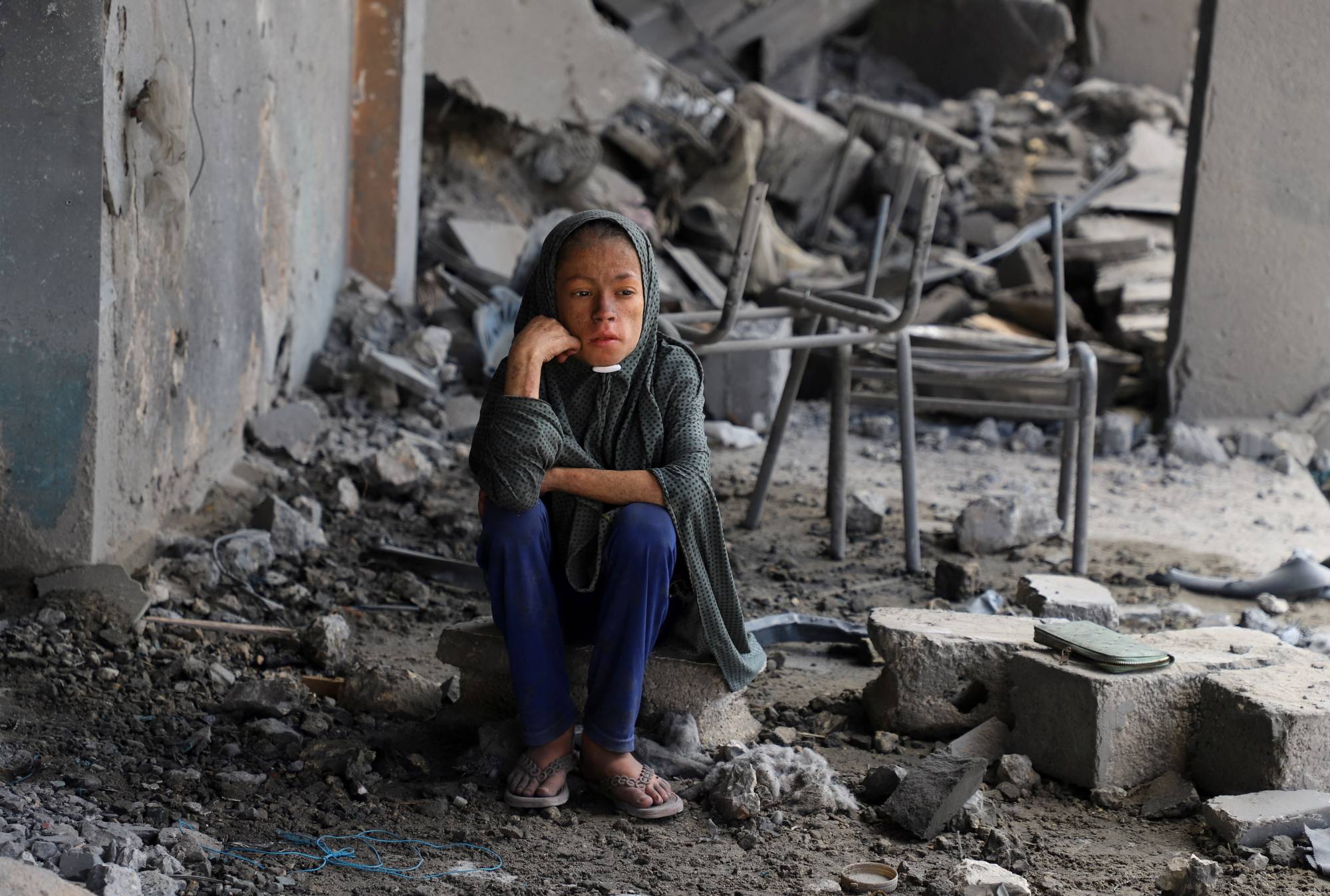 فلسطينية تجلس وسط الحطام في مدرسة تابعة للأمم المتحدة تؤوي نازحين بعد قصفها في حي الزيتون بمدينة غزة يوم الأربعاء (رويترز)