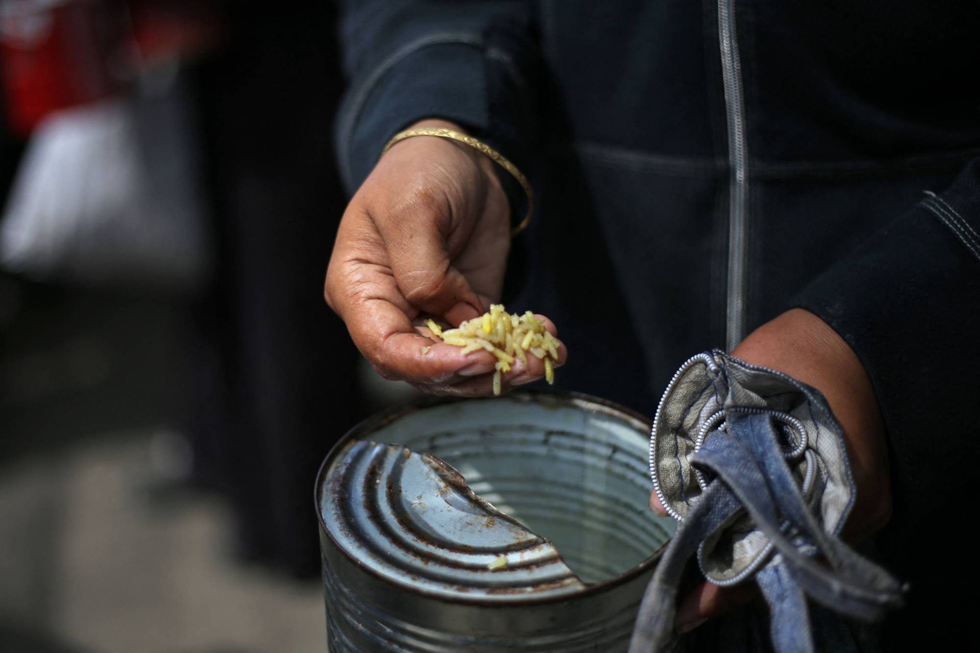 فلسطينية تأكل حفنة أرز من وعاء معدني بعدما حصلت على القليل منه من تكية خيرية في النصيرات بوسط قطاع غزة يوم الثلاثاء (أ.ف.ب)