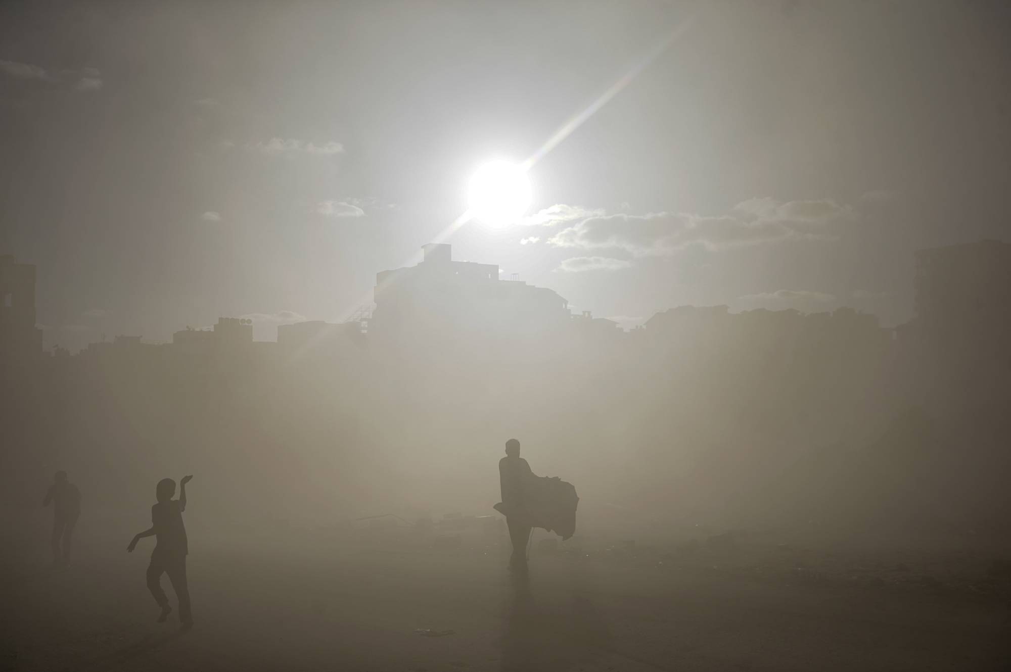 نازحون فلسطينيون يحاولون الاحتماء بعدما أطلقت مسيّرة إسرائيلية قنبلة دخانية في مدينة غزة الأربعاء الماضي (إ.ب.أ)