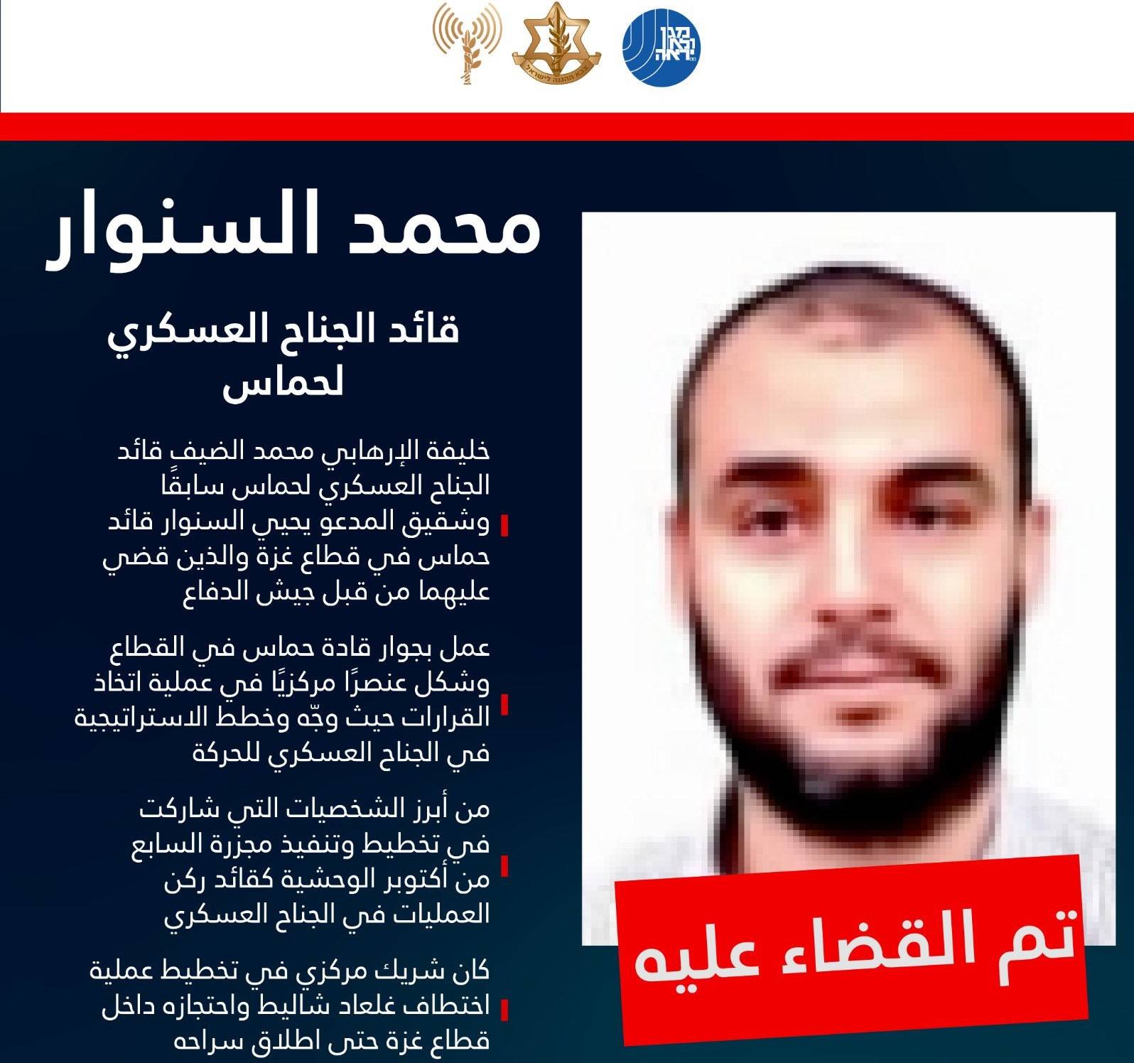 صورة نشرها الجيش الإسرائيلي للإعلان عن قتل محمد السنوار قائد «كتائب القسام»