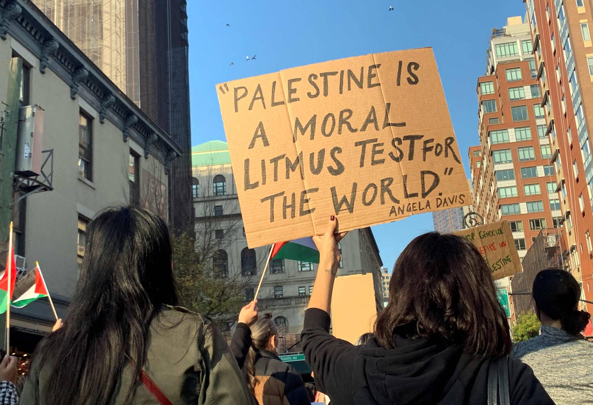 فتاة ترفع لافتة مكتوباً عليها «فلسطين اختبار أخلاقي للعالم» في مظاهرة لدعم فلسطين بنيويورك (أرشيفية - أ.ف.ب)