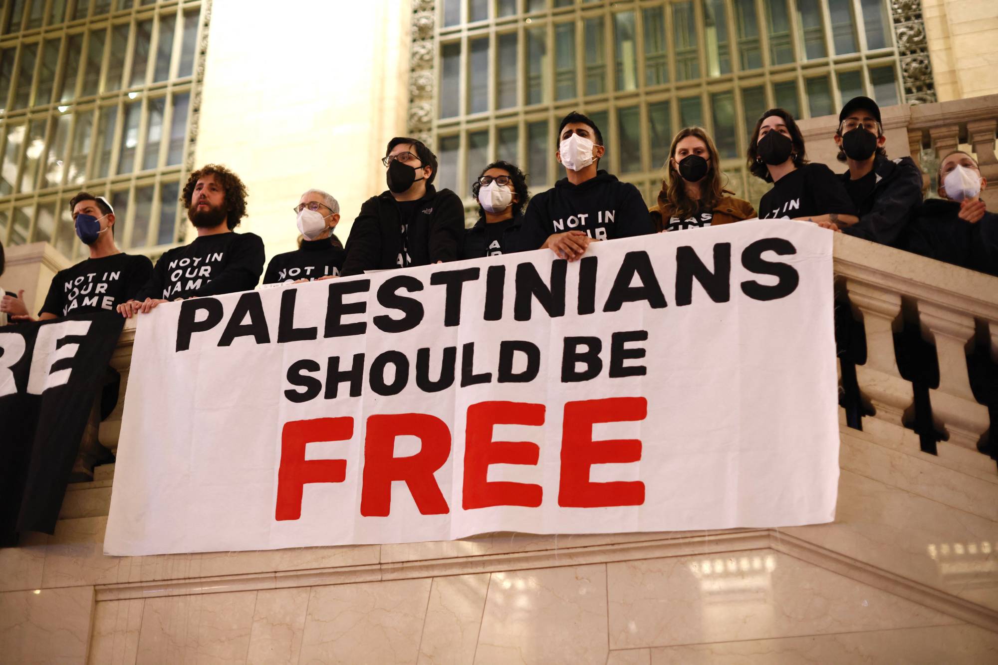 لافتة كتب عليها «الفلسطينيون يجب أن يكونوا أحراراً» تظهر وسط احتجاج على الحرب الإسرائيلية في غزة بمدينة نيويورك (أرشيفية - أ.ف.ب)