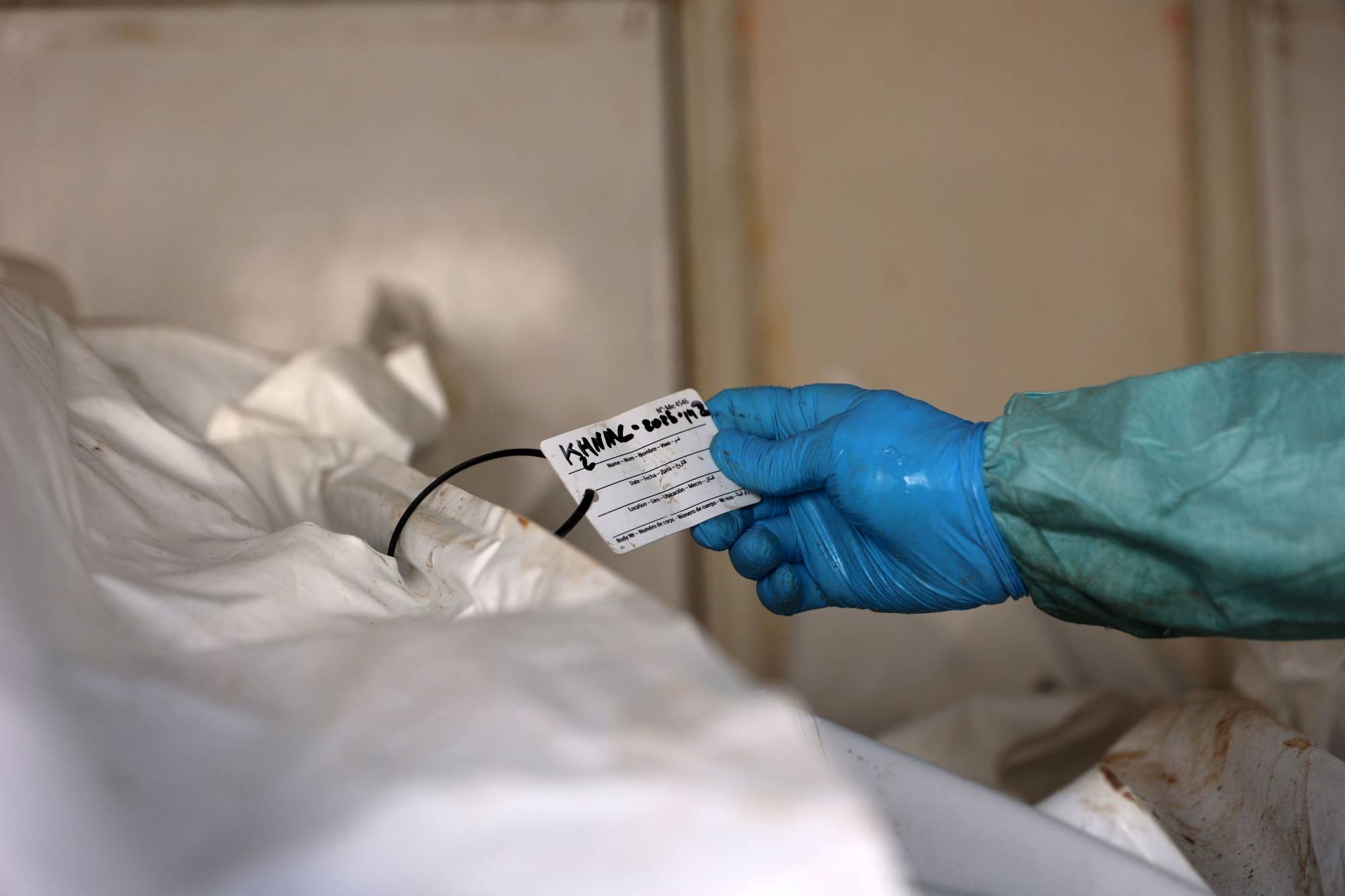 موظف بمستشفى ناصر يتفقد بطاقة تعريف على جثمان أحد الفلسطينيين الذين أعادت إسرائيل جثامينهم في خان يونس جنوب قطاع غزة (أ.ف.ب)