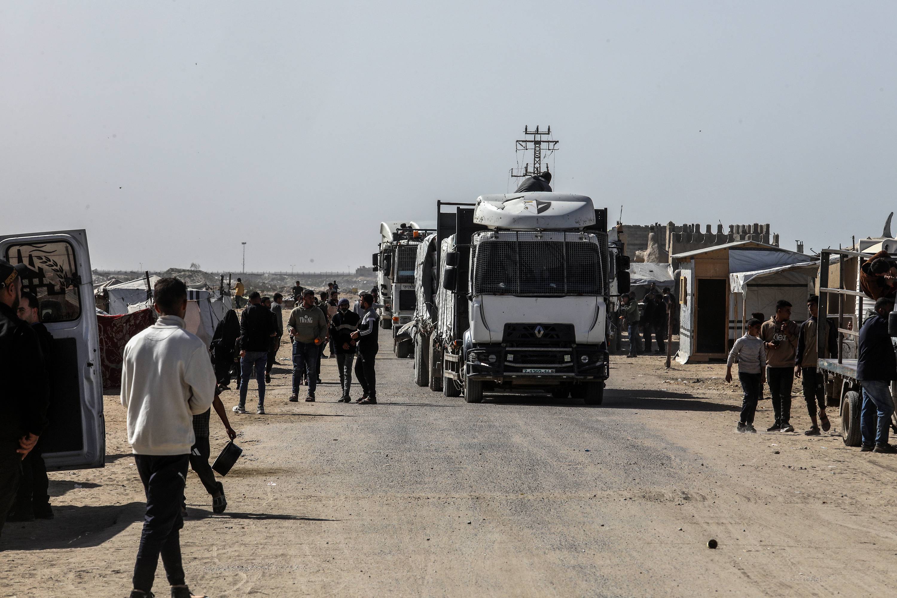 شاحنات تحمل مساعدات إنسانية تصل إلى خان يونس في جنوب قطاع غزة أمس (د.ب.أ)