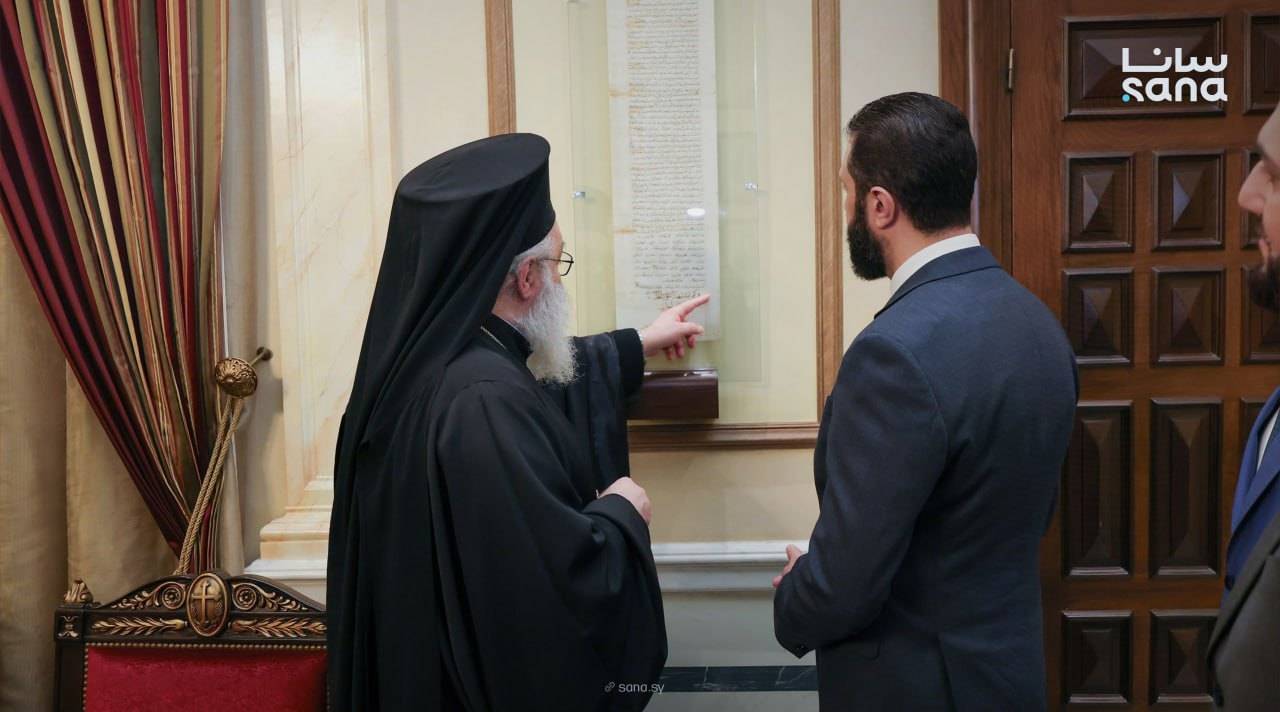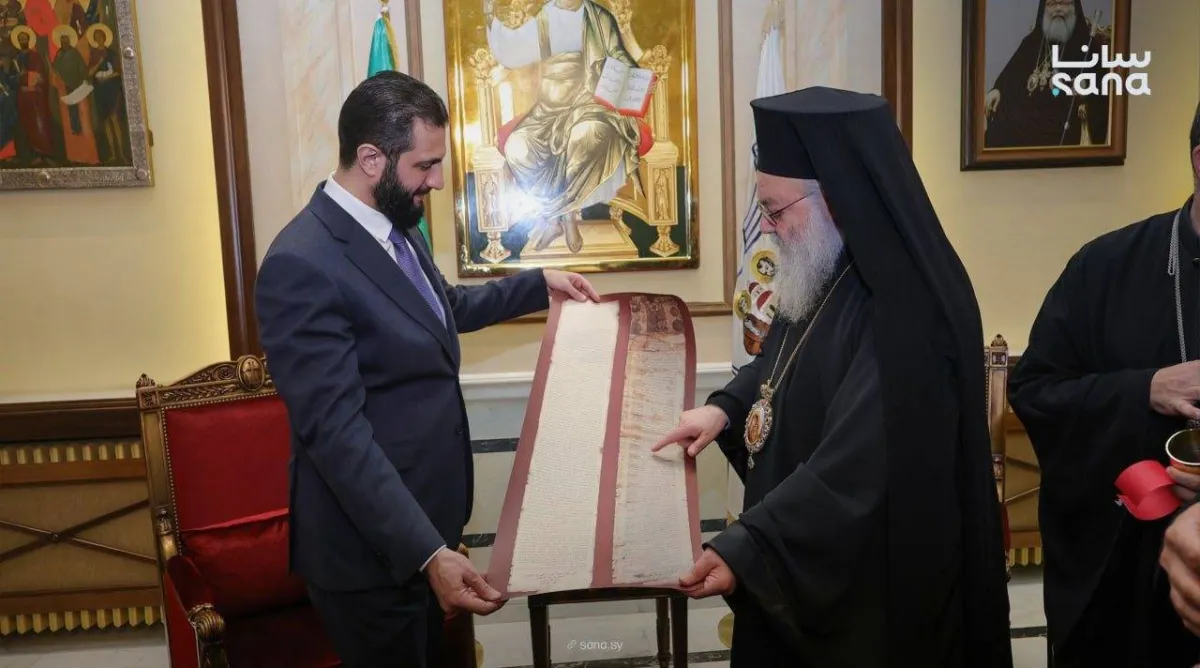حملت زيارة الرئيس السوري أحمد الشرع إلى المقر البطريركي الأنطاكي للروم الأرثوذكس في مدينة دمشق القديمة، مساء الأحد، كثيراً من الرسائل والدلالات، لا سيما أنه اطلع خلالها على «العهدة» النبوية المحفوظة في الكنسية المريمية، وتلقى نسخة منها هدية من البطريرك يوحنا العاشر يازجي، في تأكيد على المواثيق الإسلامية في العيش المشترك، وهو ما رد عليه الشرع برسالة للكنيسة جاء فيها: «دمشق لهي أول عيش مشترك عرفته البشرية»، ما عدَّه متابعون إعلان لموقف المسيحيين السوريين النهائي في علاقتهم مع السلطة السورية الجديدة، في وقت تشهد فيه البلاد حملات تحريض طائفي على خلفية الدعوات إلى التقسيم.