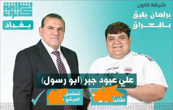 كما اختار المرشح عن بغداد علي عبود جبور أن يضع صورة نجله رسول أبو القوزي إلى جانب ملصقاته الدعائية؛ أملاً في كسب الأصوات للوصول إلى البرلمان. ويُعرَف رسول بأنه مشجع رياضي يحظى بشهرة محلية، واشتهر بلقب «أبو القوزي» بسبب ولعه بأكلة «القوزي» العراقية.