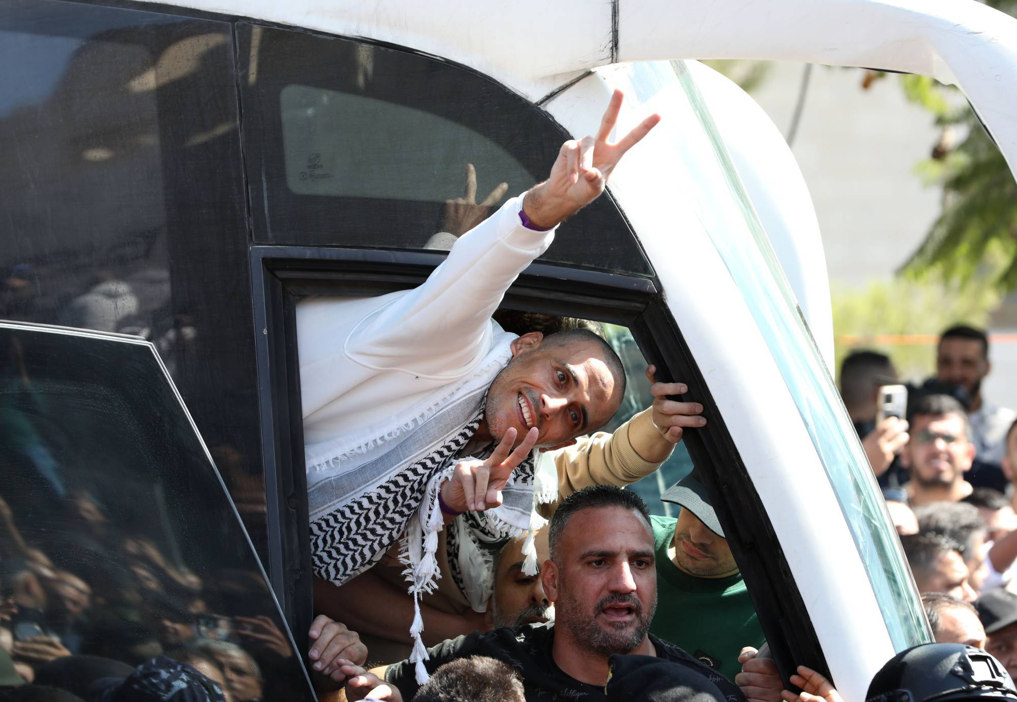 فلسطينيون مُحررون من سجون إسرائيل يرفعون علامة النصر لأقاربهم وأحبائهم من داخل حافلة في رام الله (أرشيفية - د.ب.أ)