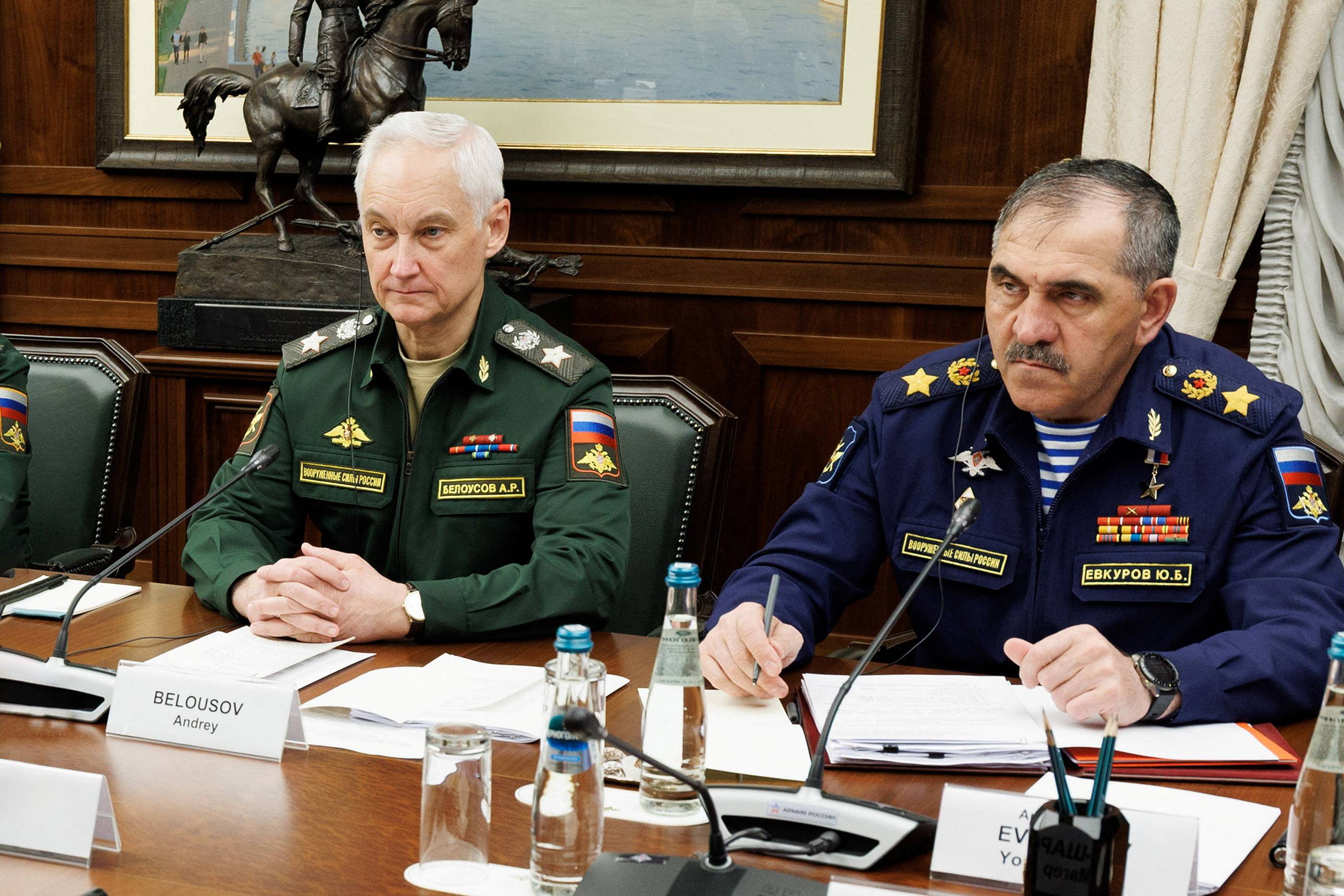 وزير الدفاع الروسي أندريه بيلوسوف (يسار) ونائب وزير الدفاع يونس-بك يفكوروف يحضران اجتماعاً مع وزير الدفاع السوري مرهف أبو قصرة في موسكو بروسيا يوم 28 أكتوبر 2025 (رويترز)