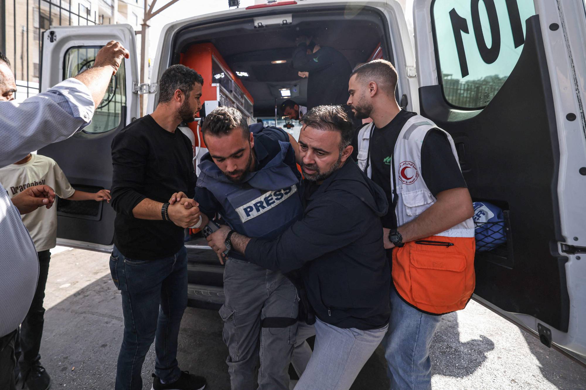 صحافي فلسطيني يخرج من سيارة إسعاف لدى وصوله إلى مستشفى رفيديا بنابلس بعد أن أصيب على يد مستوطنين إسرائيليين خلال تغطيته موسم حصاد الزيتون في قرية بيتا الفلسطينية بالضفة الغربية المحتلة (أ.ف.ب)