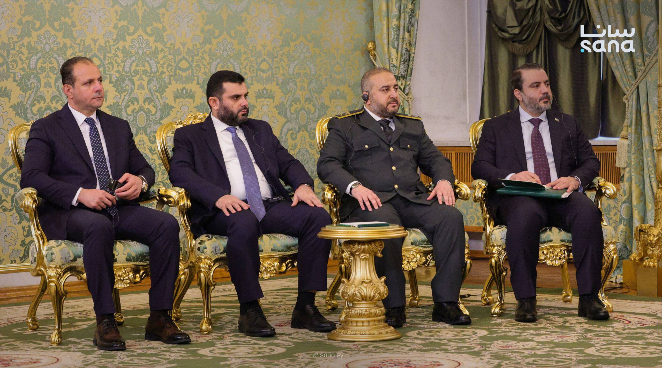 وزيرا الخارجية أسعد حسن الشيباني والدفاع اللواء مرهف أبو قصرة ورئيس الاستخبارات العامة حسين السلامة والأمين العام لرئاسة الجمهورية ماهر الشرع رافقوا الشرع في زيارته إلى موسكو نهاية يوليو (سانا)