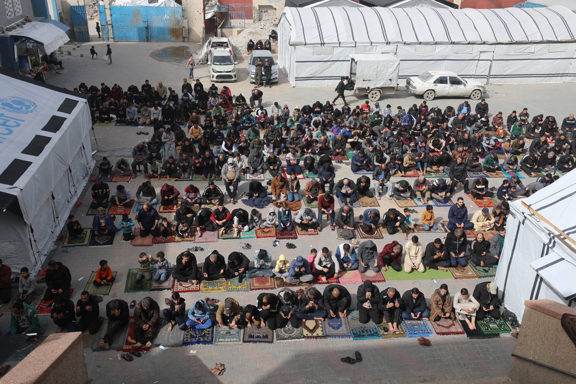 فلسطينيون يؤدون صلاة الجمعة داخل مدرسة تابعة لـ«الأونروا» تحولت لمأوى للنازحين في غزة (د.ب.أ)