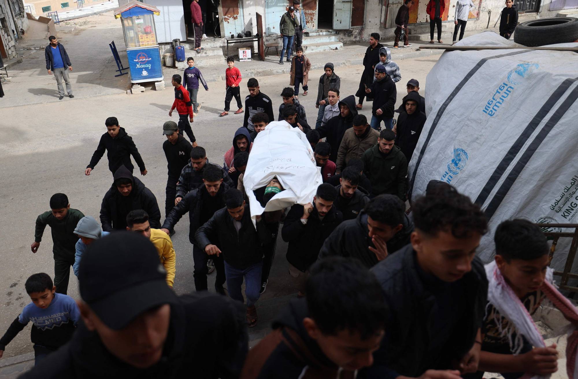 نازحون فلسطينيون يشيعون رجلاً بمخيم المغازي بعد هجوم إسرائيلي في وسط قطاع غزة الجمعة (أ.ف.ب)