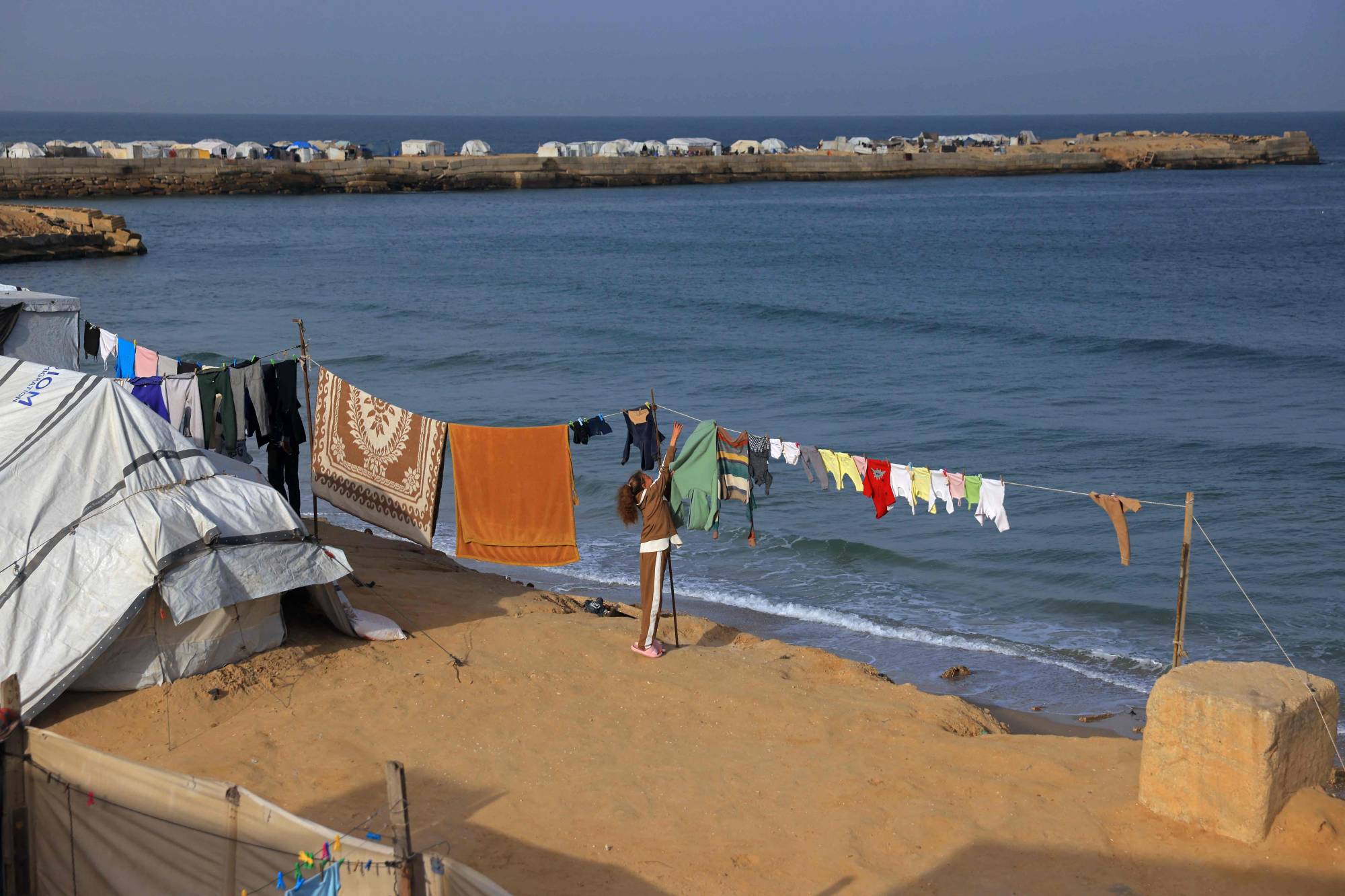فلسطينية تنشر غسيل أفراد عائلتها في مخيم للنازحين بخان يونس جنوب قطاع غزة الجمعة (أ.ف.ب)