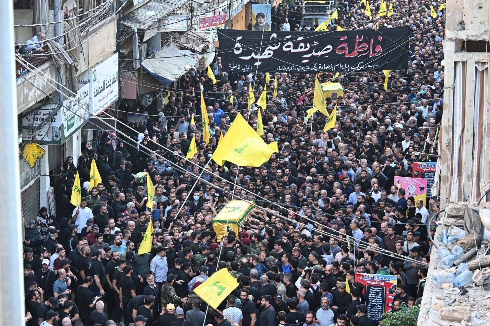 وتقدّم عناصر من الكشافة التابعة للحزب مسيرة المشيعين، وحملوا صورا لعدد من قادة الحزب والمرشد الإيراني علي خامنئي.