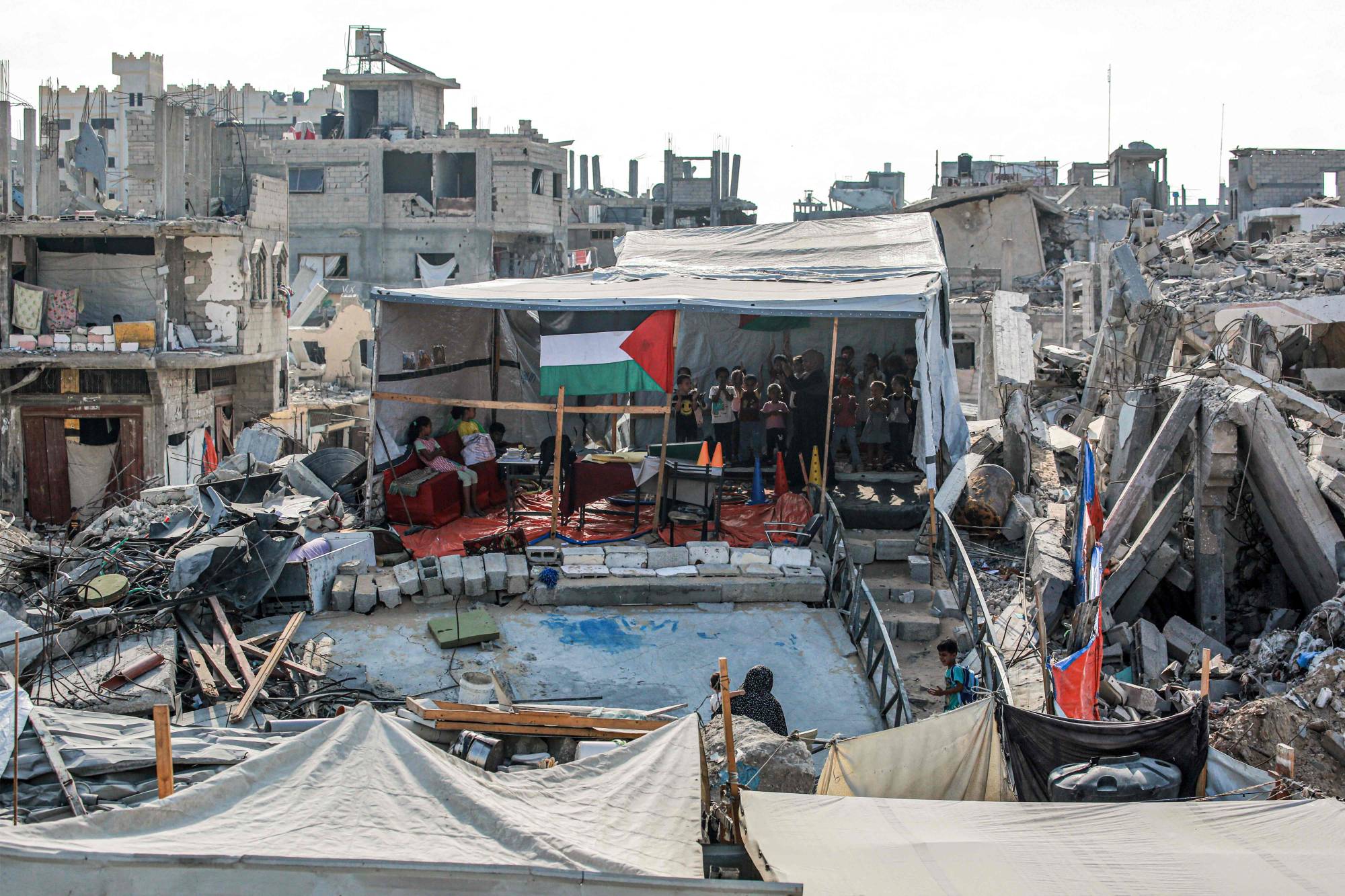 تمشي الطفلة ليان حجي فوق ركام مبانٍ مدمّرة إلى مدرستها المستحدثة. لا تحمل حقيبة ولا كتباً ولا ترتدي زيّاً مدرسياً... لكنها سعيدة باستئناف الدراسة بعد عامين من حرب مدمّرة في قطاع غزة، ولو داخل خيمة.