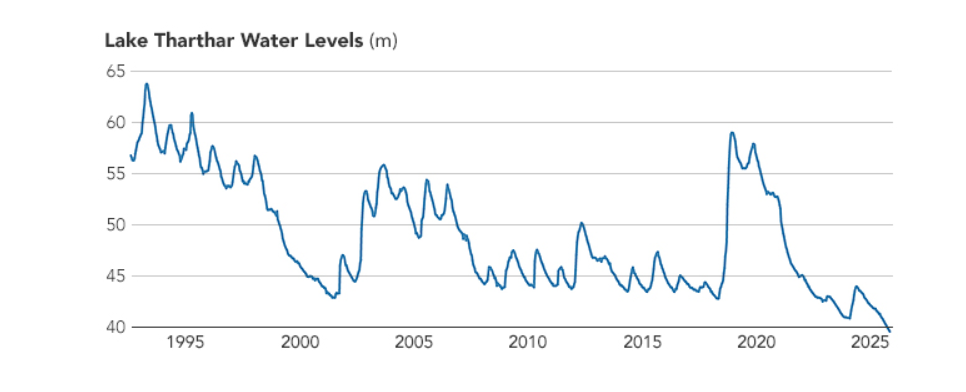 وفي هذا الإطار، أشارت وكالة «ناسا إرث»، في أكتوبر (تشرين الأول) 2025، إلى انخفاض مستوى بحيرة ثرثار (أكبر خزان مائي في العراق) إلى أدنى مستوى مسجل منذ 1992، بنسبة انخفاض تصل إلى 80 في المائة مقارنةً بـ2020، وفق موقع وكالة «ناسا»؛ بسبب الجفاف المستمر ونقص الإفراج من السدود في تركيا وإيران. وأظهرت الصور الفضائية جفافاً واسعاً، مما يهدد الزراعة والشحن النهري، ويسمح بدخول مياه البحر الملحية إلى الأعلى.