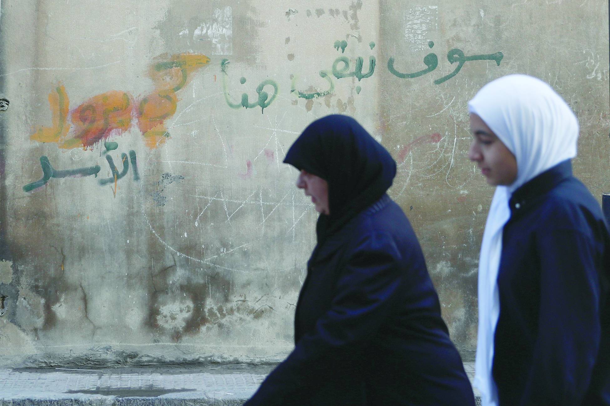 امرأتان في مدينة حمص يوم 21 نوفمبر مع اقتراب ذكرى مرور سنة على سقوط نظام بشار الأسد (أ.ب)