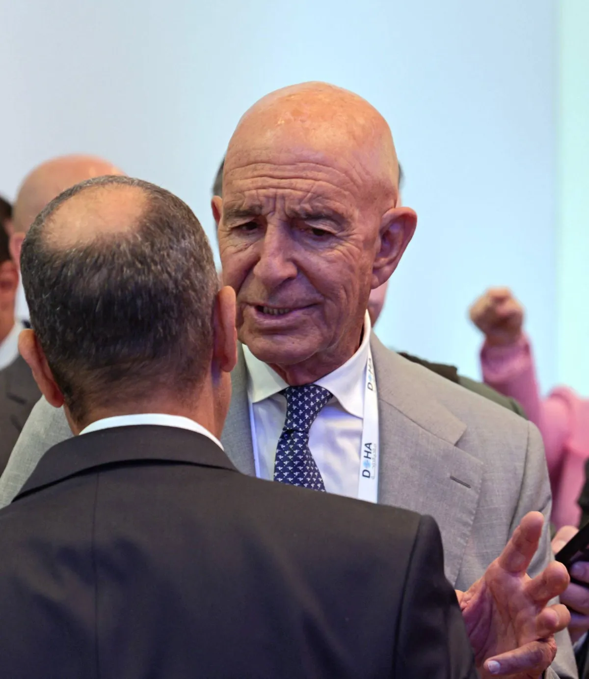 المبعوث الأميركي لسوريا توماس برّاك وهو يتحدث مع الضيوف في افتتاح «منتدى الدوحة» في قطر (أ.ف.ب)
