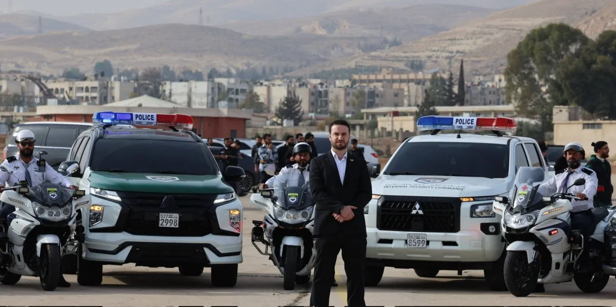 نور الدين البابا المتحدث باسم وزارة الداخلية وخلفه عدد من عناصر وسيارات الشرطة (حساب المتحدث باسم الداخلية السورية عبر منصة إكس)