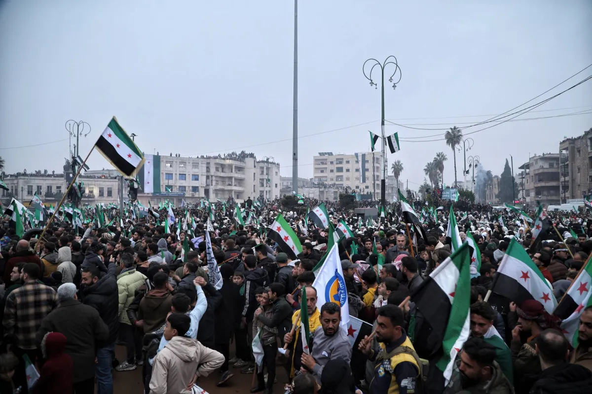 تجمع الناس خلال مسيرة إحياءً للذكرى السنوية الأولى للإطاحة بنظام بشار الأسد في إدلب (إ.ب.أ)