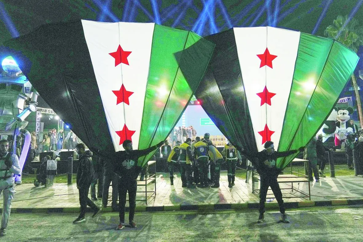 مواطنون سوريون يلوّحون بأعلامهم الوطنية خلال احتفالات الذكرى السنوية الأولى لإطاحة الرئيس السابق بشار الأسد في دمشق (أ.ب)