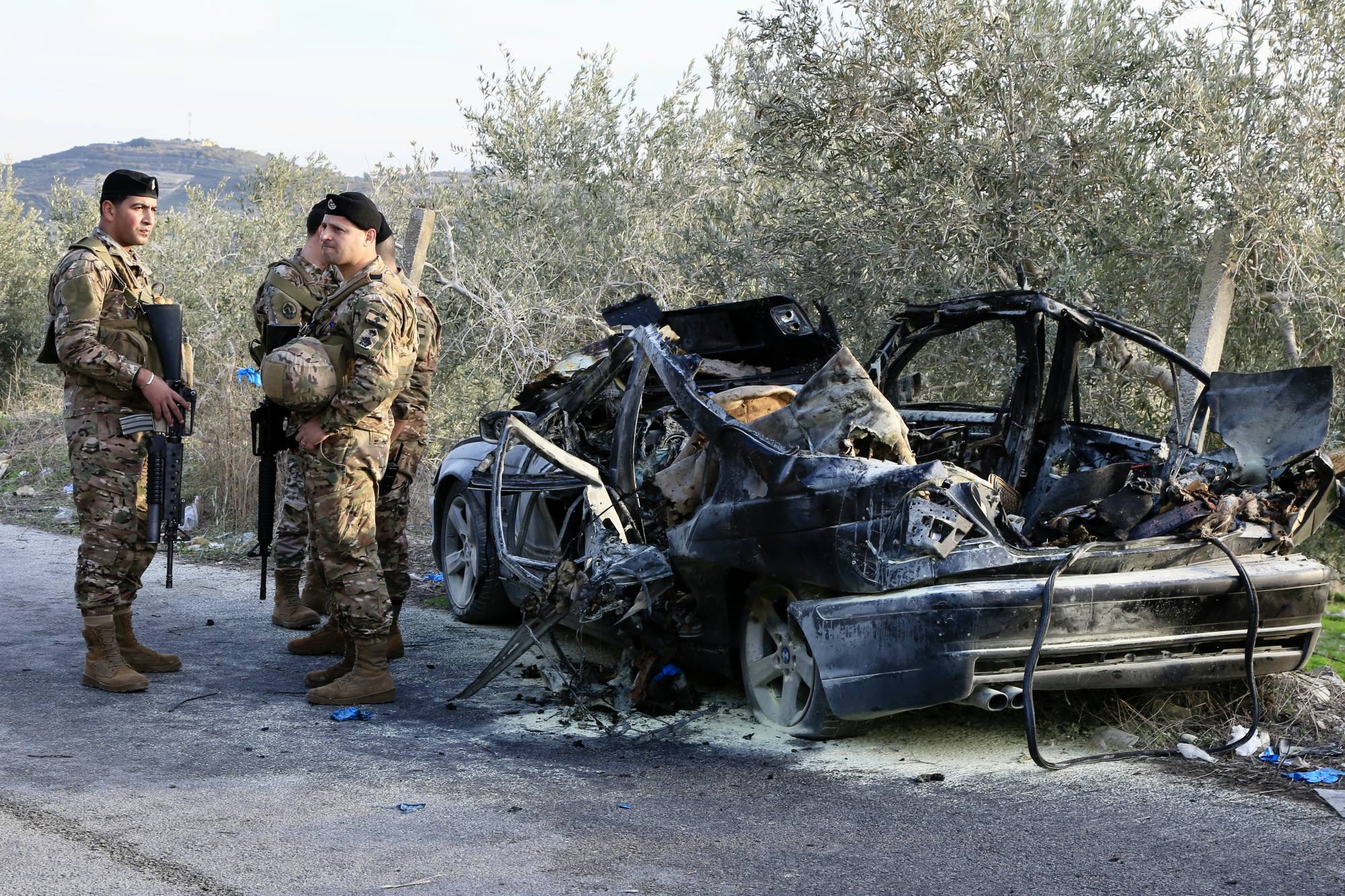 عناصر في الجيش اللبناني يعاينون السيارة التي تم استهدافها في بلدة عتقنيت ما أدى إلى مقتل 3 أشخاص بينهم عسكري (إ.ب.أ)