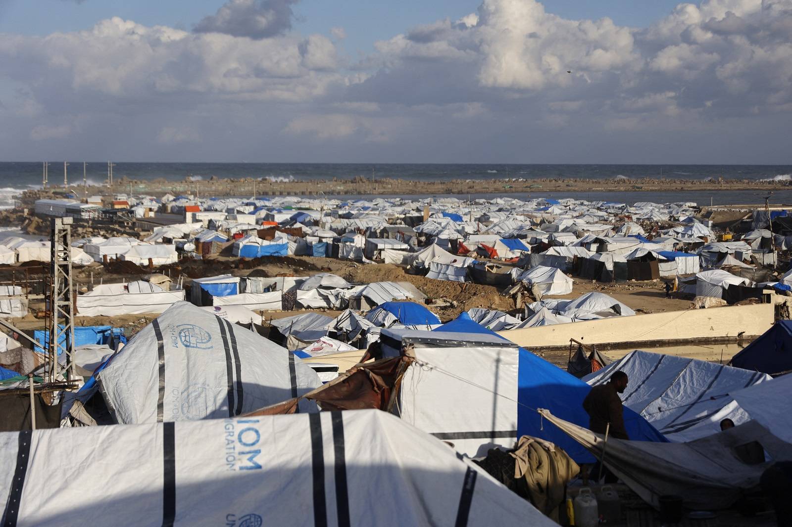 نصب خيام الفلسطينيين النازحين التي تحميهم من ظروف الشتاء القاسية على طول الواجهة البحرية في مدينة غزة (أ.ف.ب)