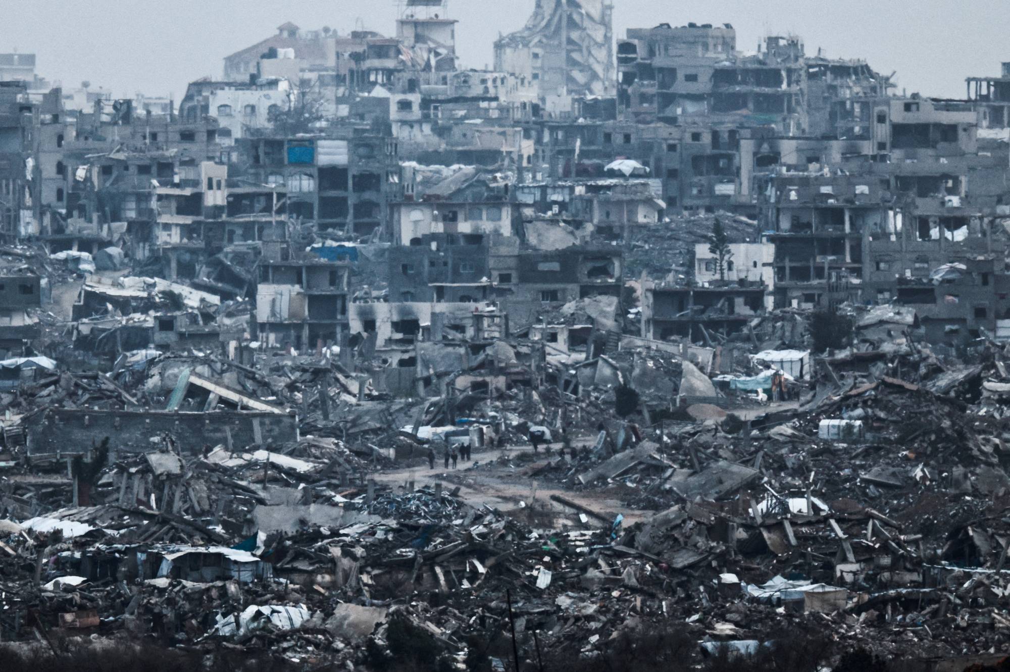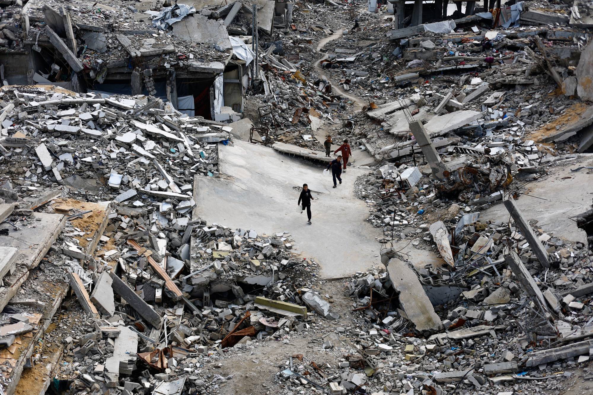 فلسطينيون يسيرون أمام المباني المدمرة في أعقاب العمليات العسكرية الإسرائيلية في مدينة غزة (رويترز)