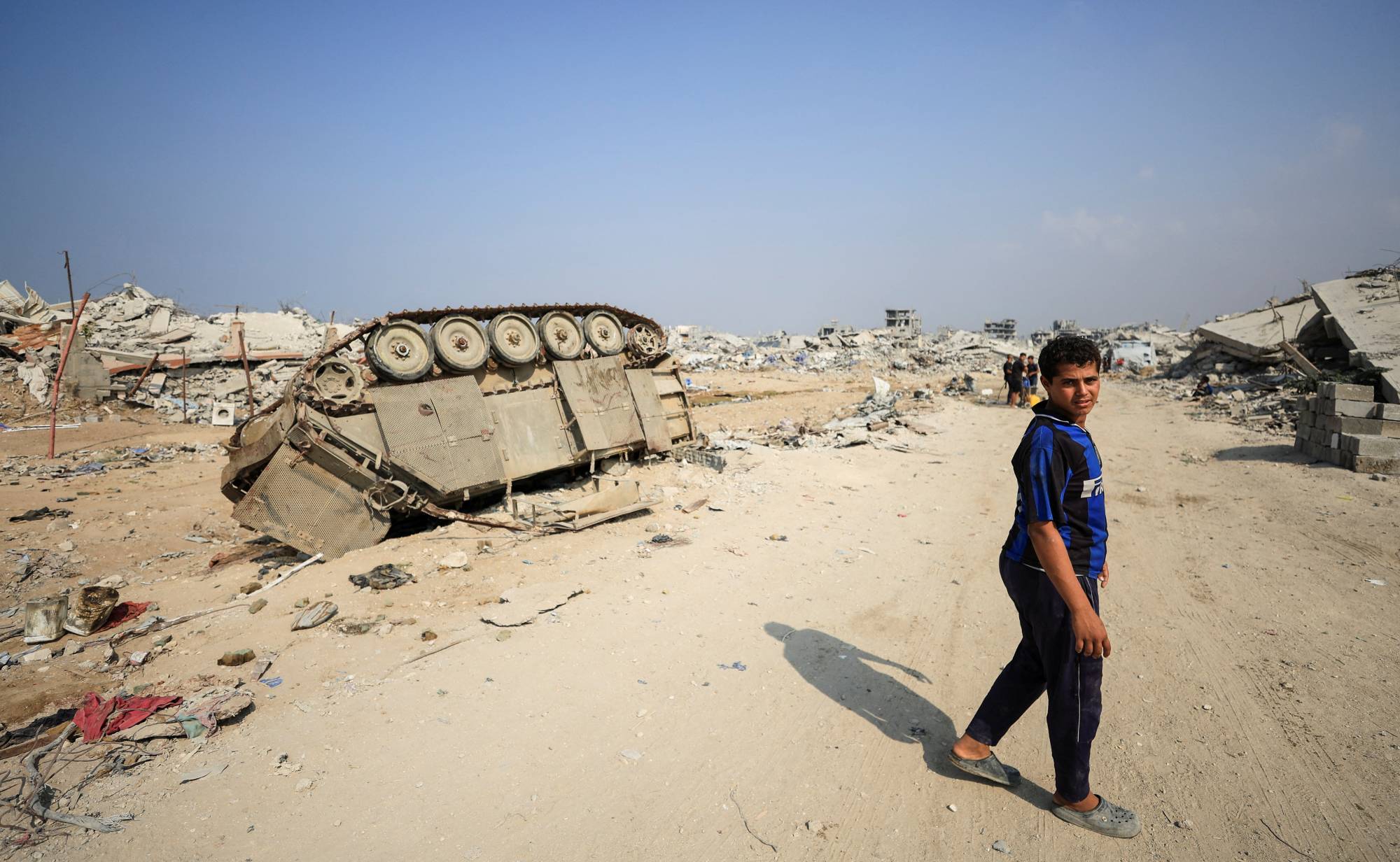 فلسطيني يسير بجوار ناقلة جند مدرعة ومبانٍ مدمرة بعد العمليات العسكرية الإسرائيلية في مدينة غزة (رويترز)