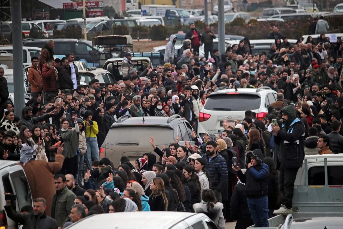 مواطنون تجمعوا حول مركبات تنقل مقاتلين أكراداً من مدينة حلب الشمالية أمس الأحد (أ.ف.ب)