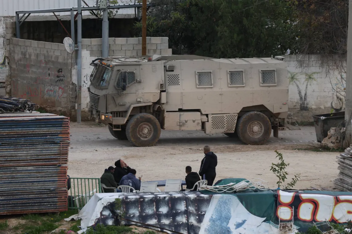فلسطينيون يشاهدون آلية عسكرية إسرائيلية تنقل جنوداً إلى مخيم نور شمس قرب طولكرم بالضفة الغربية (إ.ب.أ)