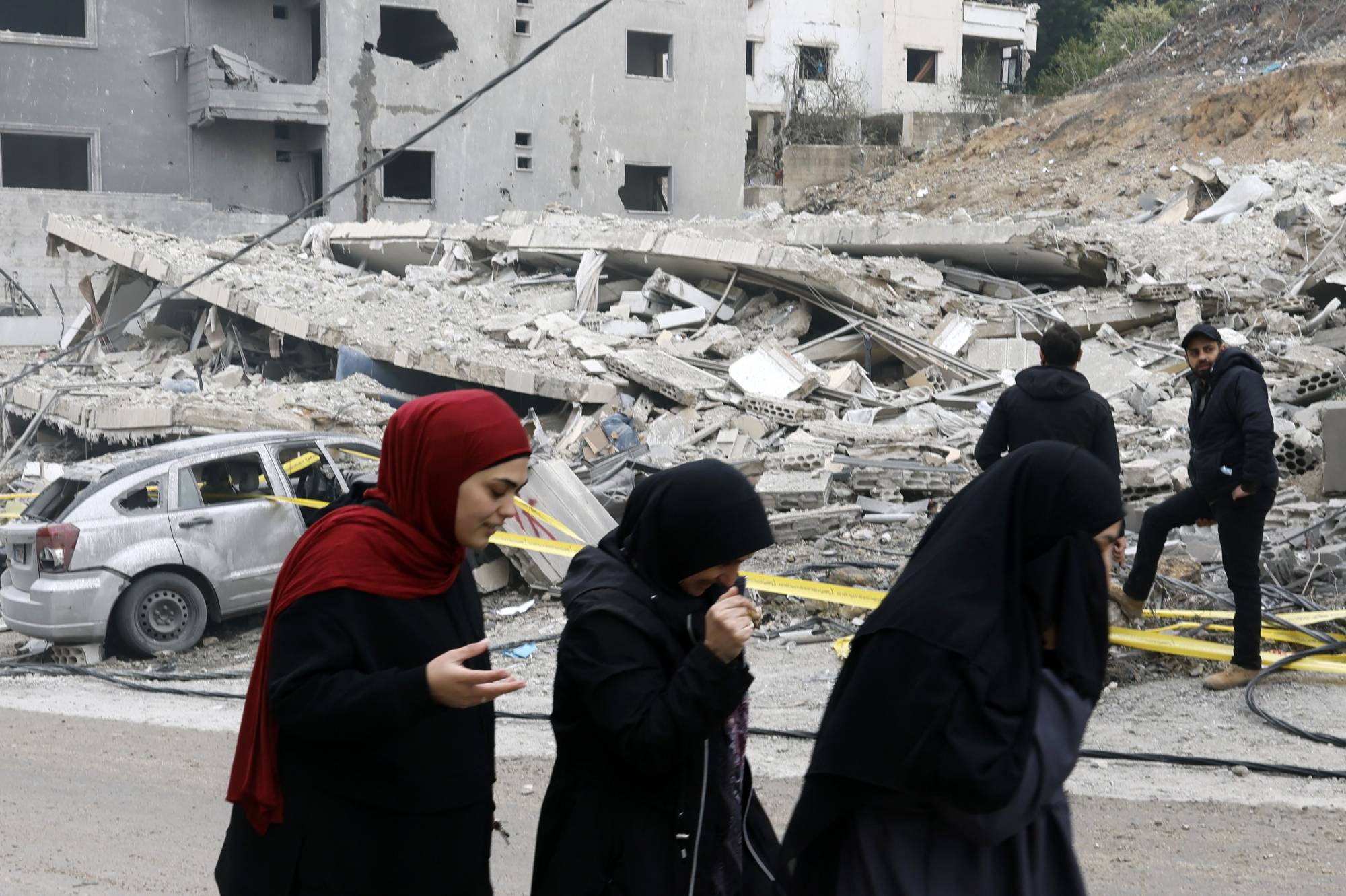 نازحات من موقع استهداف إسرائيلي في بلدة قناريت بجنوب لبنان أدّى إلى تدمير 4 مبانٍ يوم 21 يناير (إ.ب.أ)