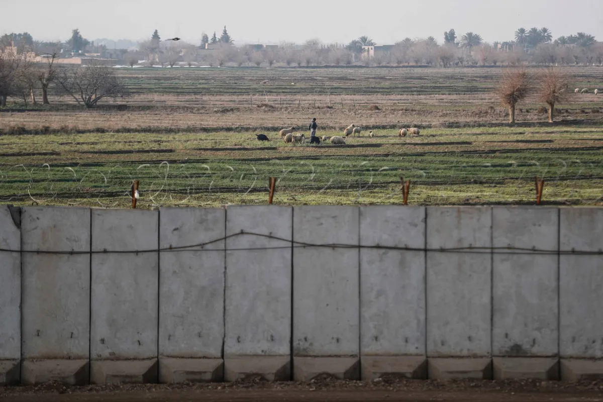 صورة التُقطت من القائم على الجانب العراقي من الحدود مع سوريا تُظهر راعياً سورياً يُراقب أغنامه وهي ترعى في حقول قرب جدار خرساني (أ.ف.ب)